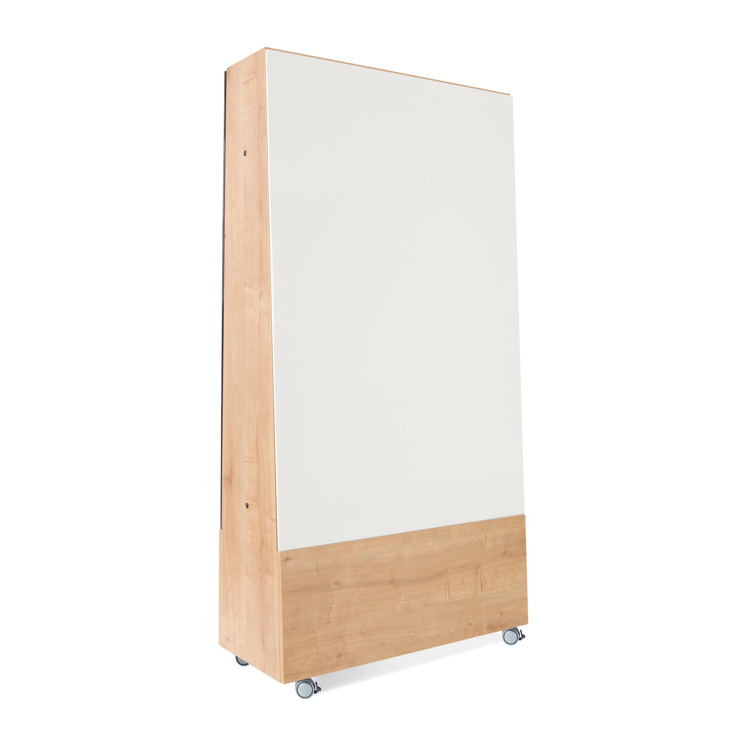 Rocada dobbeltsidet mobil whiteboard 100 x 198 cm., på hjul, med natur detaljer.Dybde 40 cm. med 2 whiteboard tavler.Rocada mobile, dobbeltsidede, magnetiske whiteboard tavle i lakeret stål, med detaljer i melamin med flot træstruktur.Slidstærk whiteboardoverflade på begge sider, 100 x 150 cm., lavet af 0,8 mm. stål der sikrer lang levetid, giver ekstra præsentationsmulighed. Tavlerne monteres nemt, på begge sider, med det medfølgnede, patenterede magnet system.Skriv på begge sider af tavlen med en whiteboard- eller glastavle marker.Aftørres nemt med en tavlesvamp eller klud.Hjul med bremser.Denne mobile whiteboard er fra det spanske kvalitetsmærke Rocadas Natural-serie.NATURAL serien fra Rocada er inspireret af naturen, flot og unikt design, kraftig kvalitet, der giver både pæn og solid støtte til møder og præsentationer.Flot og meget velegent i mødelokaler og på kontorer.