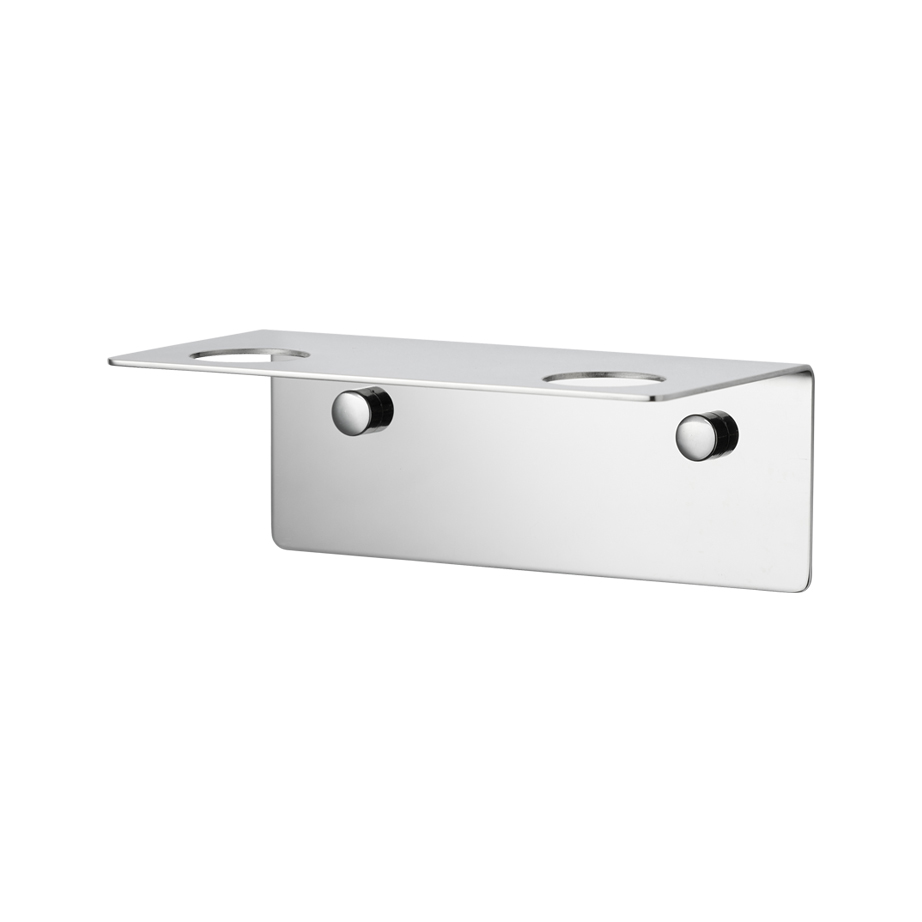 Krom sæbeholder til væg 2 flaskerMed en sæbeholder til væggen kan du frigøre plads omkring håndvasken eller i badet og sørge for, at din sæbe, shampoo eller balsam altid er lige ved hånden. Denne sæbeholder er designet til to flasker og er fremstillet i rustfrit stål med en blank krom finish. Materialet er modstandsdygtigt over for fugt, hvilket gør sæbeholderen ideel til vådrum. Sæbeholderen monteres nemt med to skruer, og de medfølgende dækpropper sørger for, at skruerne er skjult, så udtrykket forbliver elegant og minimalistisk.Denne væghængte sæbeholder passer perfekt sammen med NAGAs øvrige badeværelsestilbehør i rustfrit stål.Mål: L: 15,5 cm. D: 7,5 cm. H: 5,5 cm.Hullet måler 2,8 cm i diameter