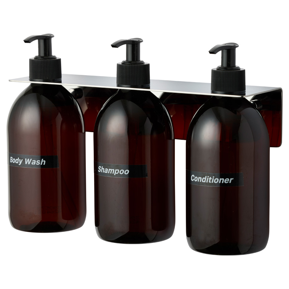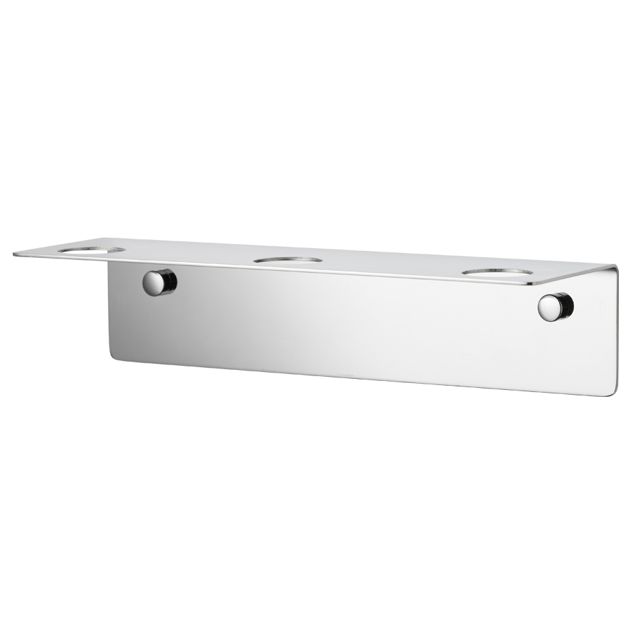 Krom sæbeholder til væg 3 flaskerMed en sæbeholder til væggen kan du frigøre plads omkring håndvasken eller i badet og sørge for, at din sæbe, shampoo eller balsam altid er lige ved hånden. Denne sæbeholder er designet til tre flasker og er fremstillet i rustfrit stål med en blank krom finish. Materialet er modstandsdygtigt over for fugt og nemt at holde rent, hvilket gør sæbeholderen ideel til vådrum. Sæbeholderen monteres nemt med to skruer, og de medfølgende dækpropper sørger for, at skruerne er skjult, så udtrykket forbliver elegant og minimalistisk.Denne væghængte sæbeholder passer perfekt sammen med NAGAs øvrige badeværelsestilbehør i rustfrit stål.Mål: L: 15,5 cm. D: 7,5 cm. H: 5,5 cm.Hullet måler 2,8 cm i diameter
