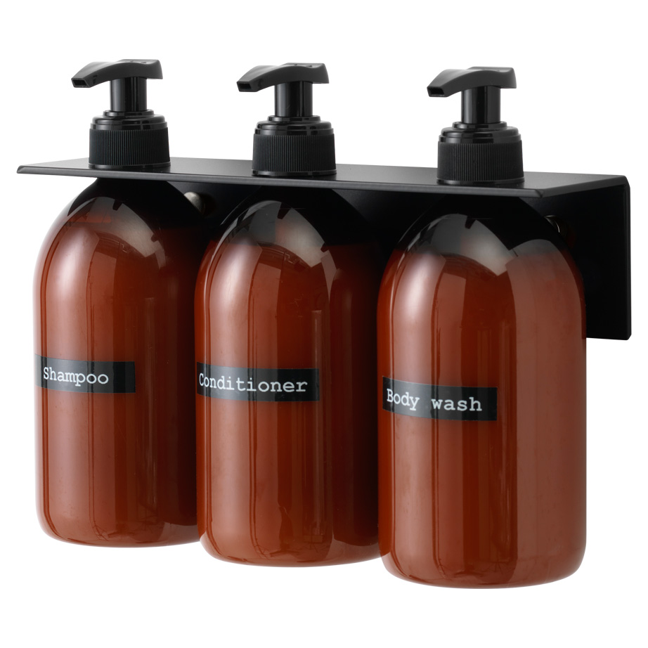 Sort sæbeholder til væg 3 flaskerMed en sæbeholder til væggen kan du frigøre plads omkring håndvasken eller i badet og sørge for, at din sæbe, shampoo eller balsam altid er lige ved hånden. Denne sorte sæbeholder er designet til tre flasker og er fremstillet i rustfrit stål. Materialet er modstandsdygtigt over for fugt og nemt at holde rent, hvilket gør sæbeholderen ideel til vådrum. Sæbeholderen monteres nemt med to skruer, og de medfølgende dækpropper sørger for, at skruerne er skjult, så udtrykket forbliver elegant og minimalistisk.Denne væghængte sæbeholder passer perfekt sammen med NAGAs øvrige badeværelsestilbehør i rustfrit stål.Mål: L: 25,5 cm. D: 7,5 cm. H: 5,5 cm.Hullet er 2,8 cm. i diameter
