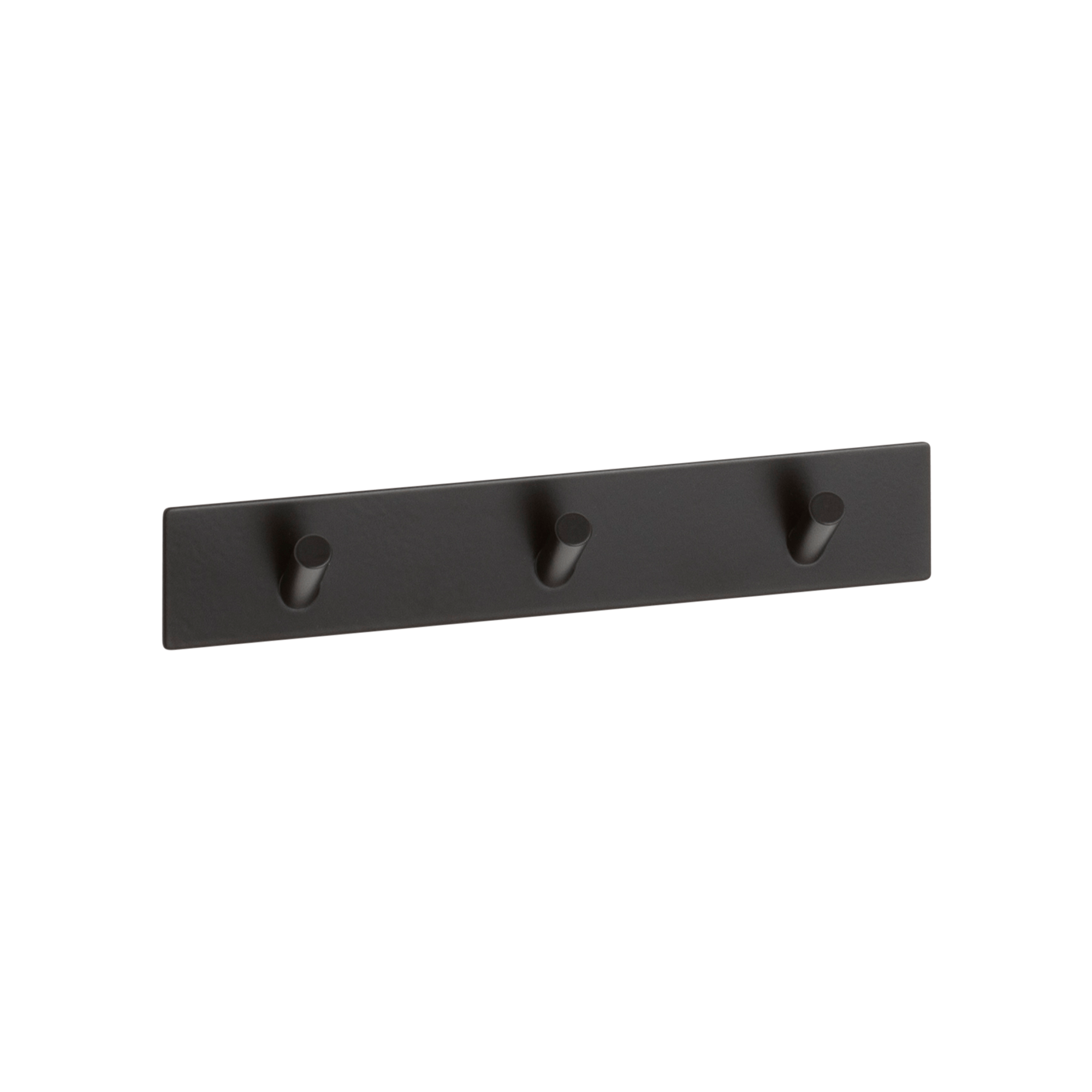 Selvklæbende knagerække med tre kroge. 20 x 4 cm. Matsort metal.Men denne knagerække er du fri for at bore huller i væggen og fliserne på badeværelset, da knagerækken er monteret med dobbeltklæbende 3M tape. Knagerækken monteres enkelt på plane, rene og glatte overflader. Knagerækken er velegnet som holder til viskestykker, håndklæder og andre, mindre ting.Rengør overfladen godt inden montering, og lad limen hærde i 24 timer inden brug.