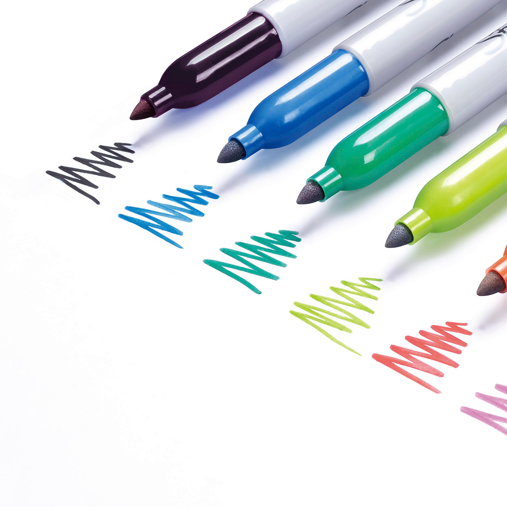 Med de farveintensive og langtidsholdbare Sharpie permanente tuscher kan du lave lidenskabeligt kreative mærker på almindelige overflader. De lyse Sharpie-tusser skriver på praktisk talt enhver overflade – der er ingen chance for kedsomhed. Sharpie blækket tørrer hurtigt og er modstandsdygtigt over for vand og falmning. Mens kedelige efterligninger langsomt falmer, vil dine kreationer med Sharpie-markører holde. Sharpie permanente tuscher har et fint tip til fantastisk smukke linjer og inspirerer dig til at være kreativ.