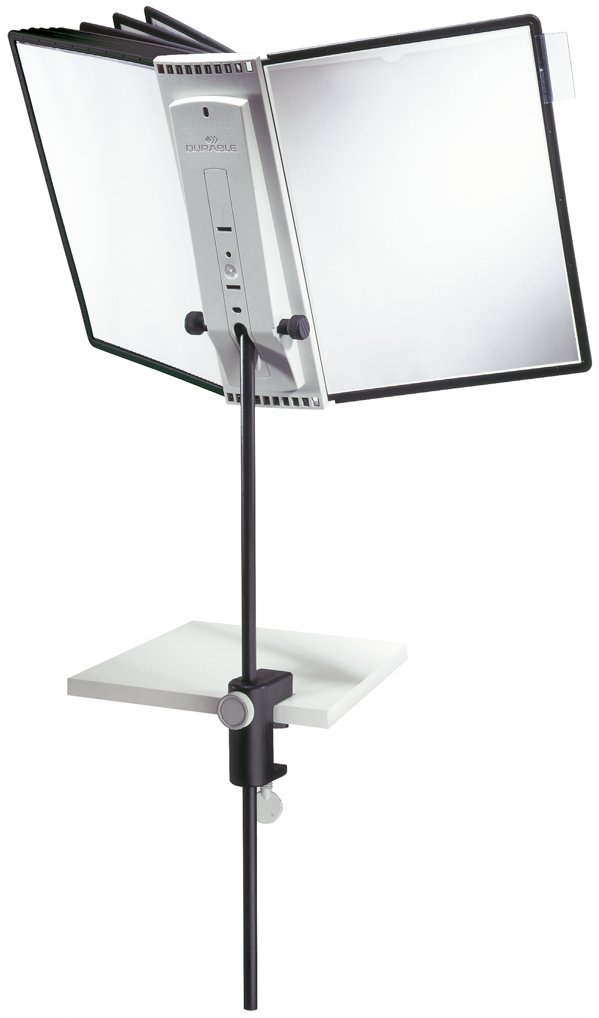 Arm med bordklemme til registersystem/displaysystem SHERPA®. Justerbar højde op til 78cm over bordpladen. Læsning vinkel variabel fra 5° til 90°. Leveres med 10 stk. lommer i sort polypropylen. Kan monteres på bordplader med max tykkelse 50mm. 5 års garanti hvis produktet har en defekt som skyldes en fabrikationsfejl. https://www.durable.dk/service/durable-garanti/sherpavario-garanti.html