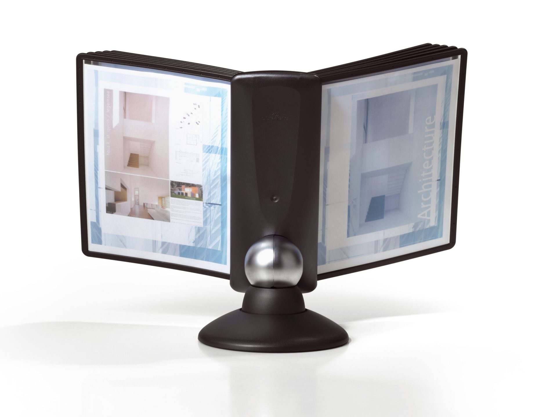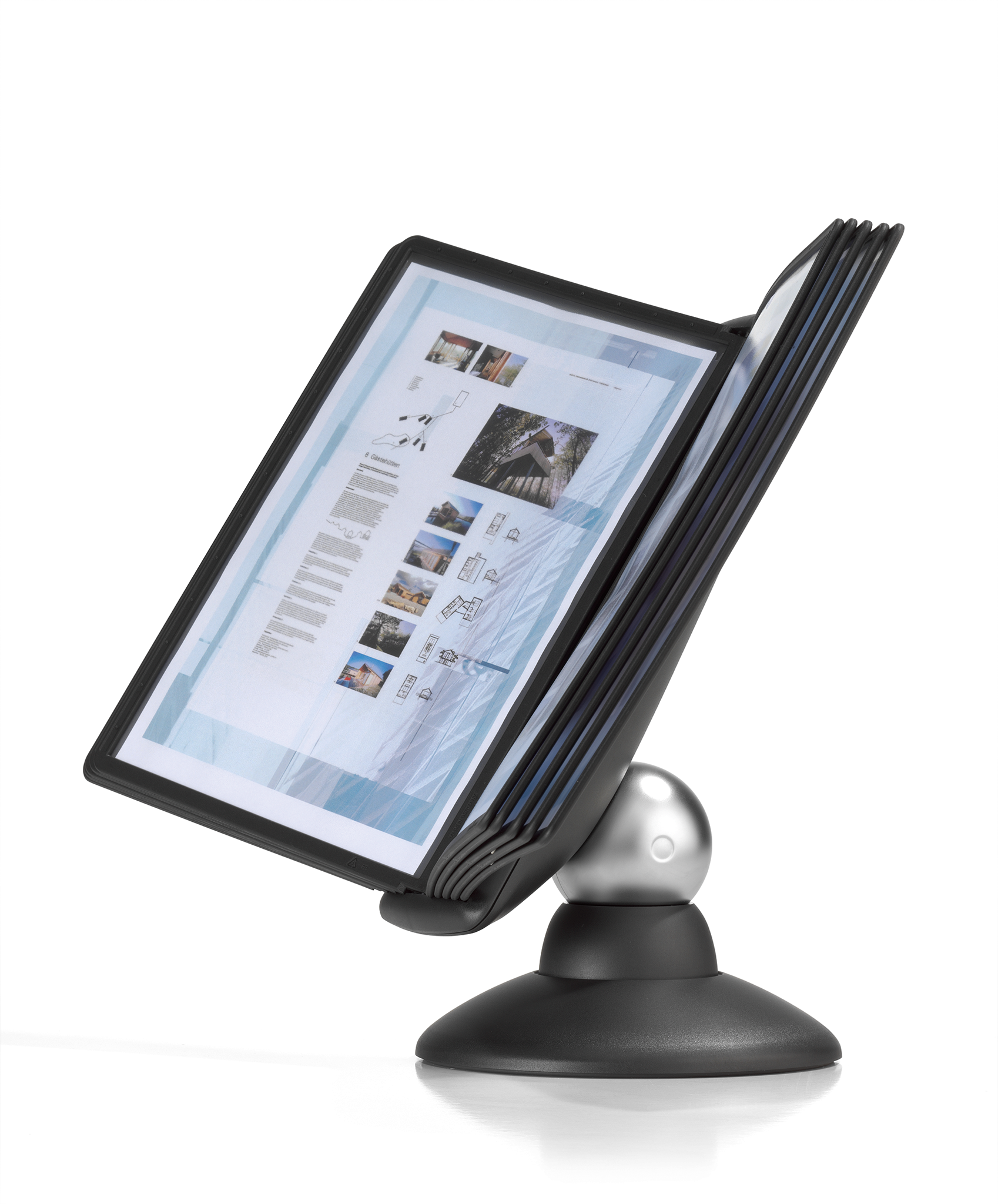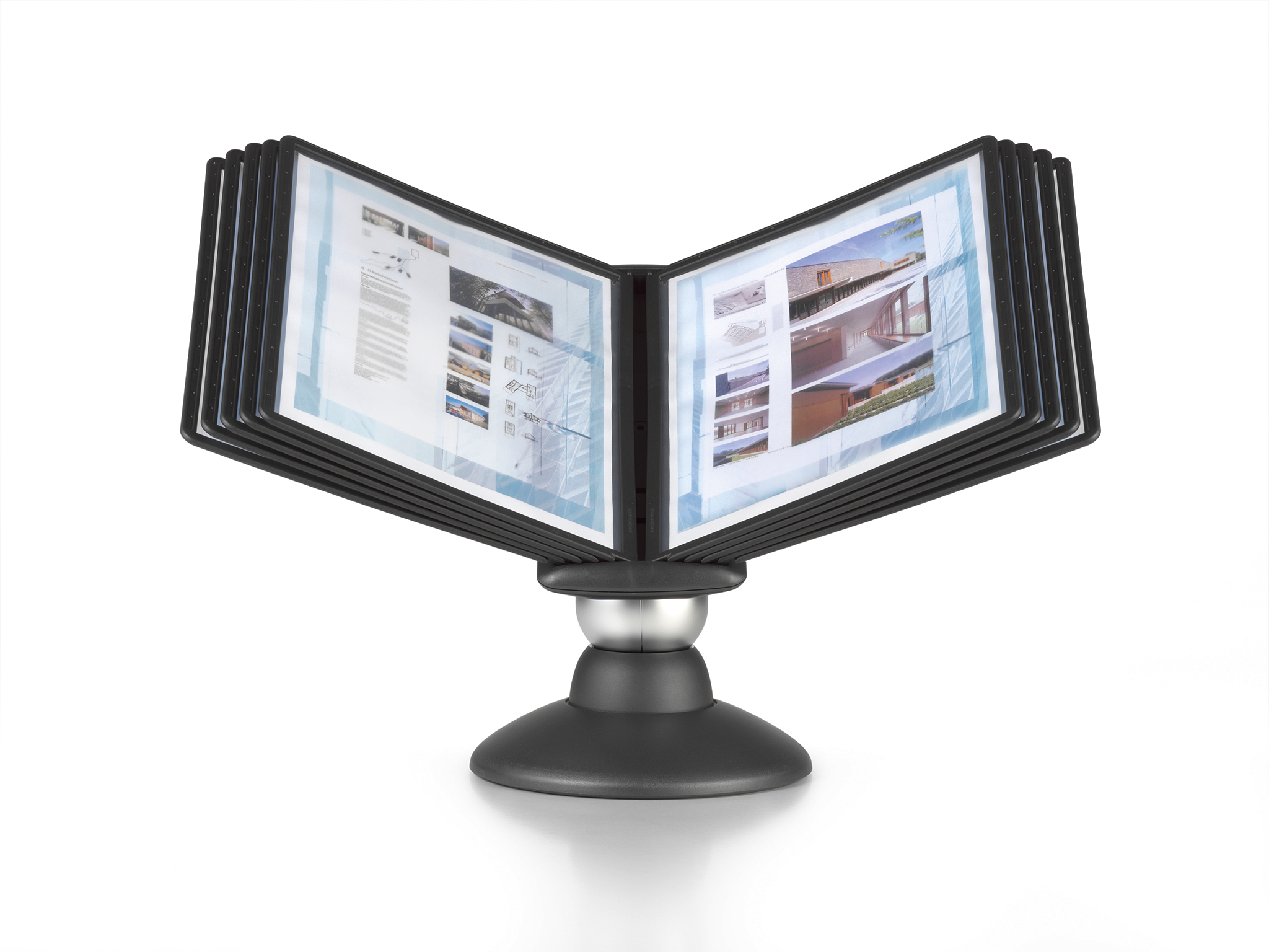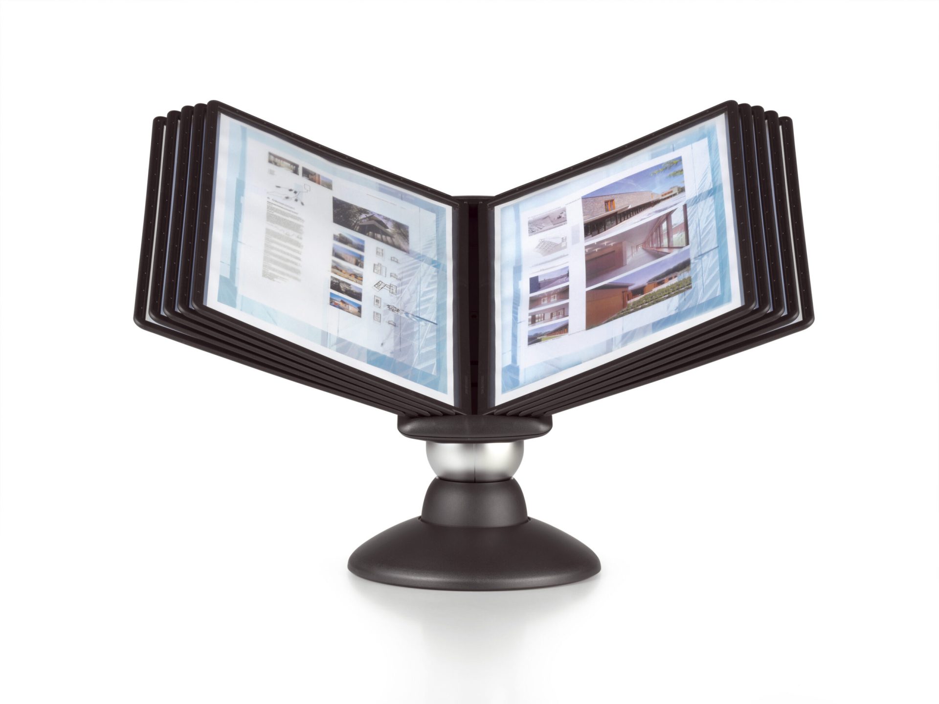 Roterende displaysystem med 10 stk. lommer A4. En galvaniseret bold forbinder konsollen der holder lommerne med foden, der giver 360 ° rotation. Læsning vinkel variabel fra 25 ° til 70 °. Oversigtsystemet er ideel til en bred vifte af applikationer: brug på arbejdspladsen når stående eller siddende, position mellem flere arbejdsstationer. Med etiketholder. 5 års garanti hvis produktet har en defekt som skyldes en fabrikationsfejl. https://www.durable.dk/service/durable-garanti/sherpavario-garanti.html
