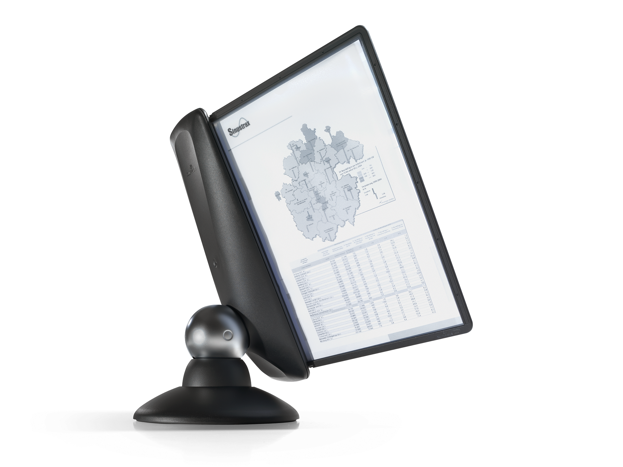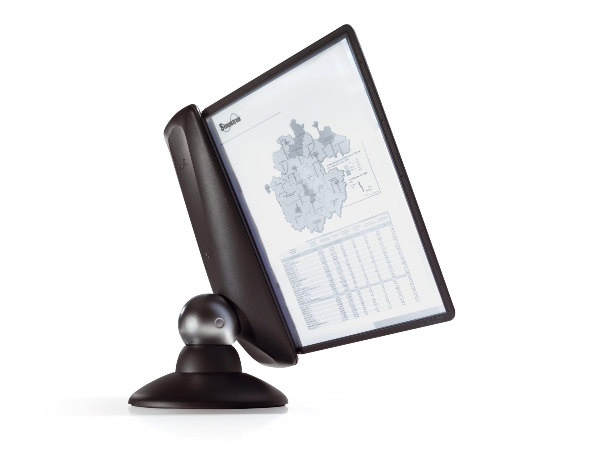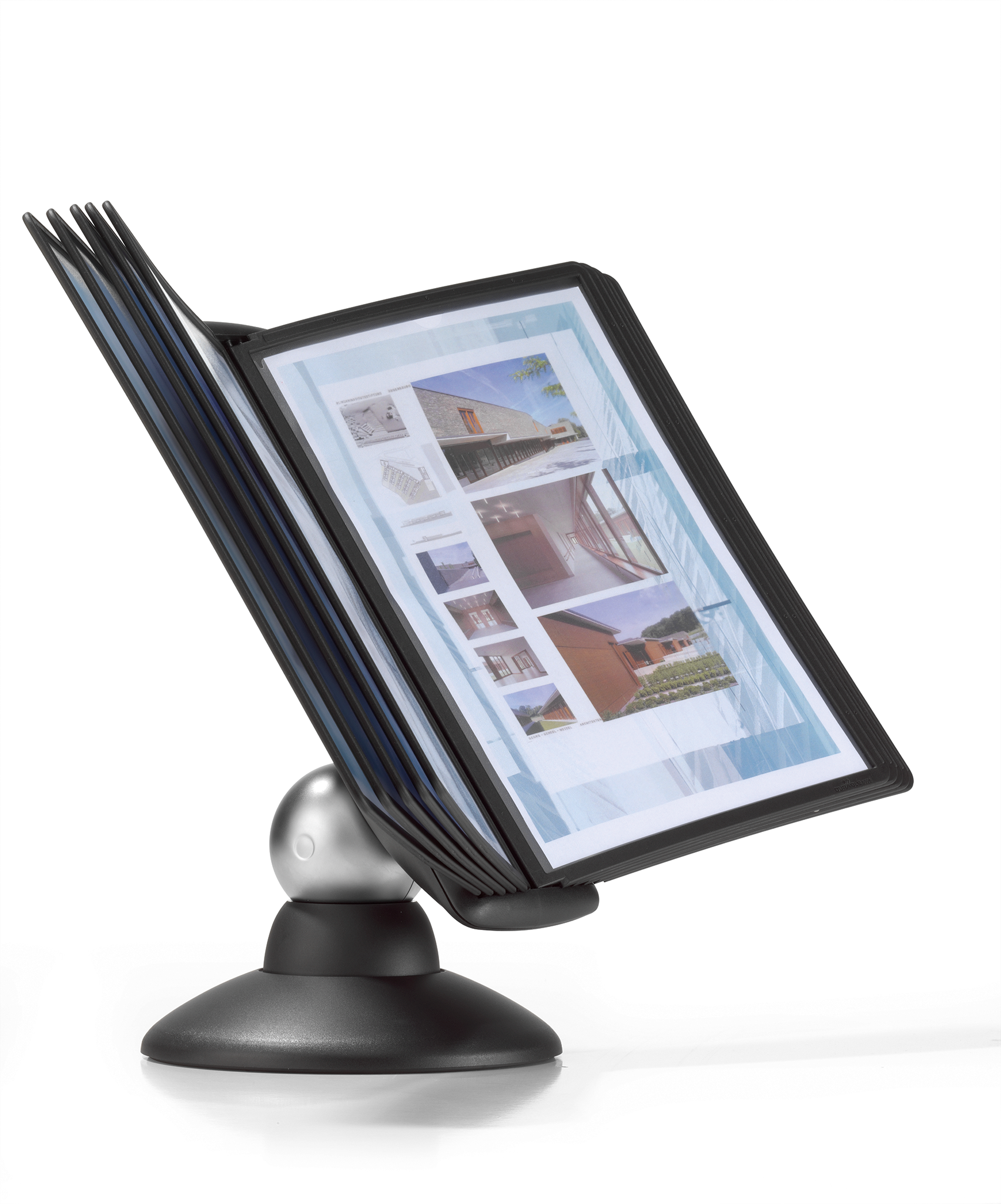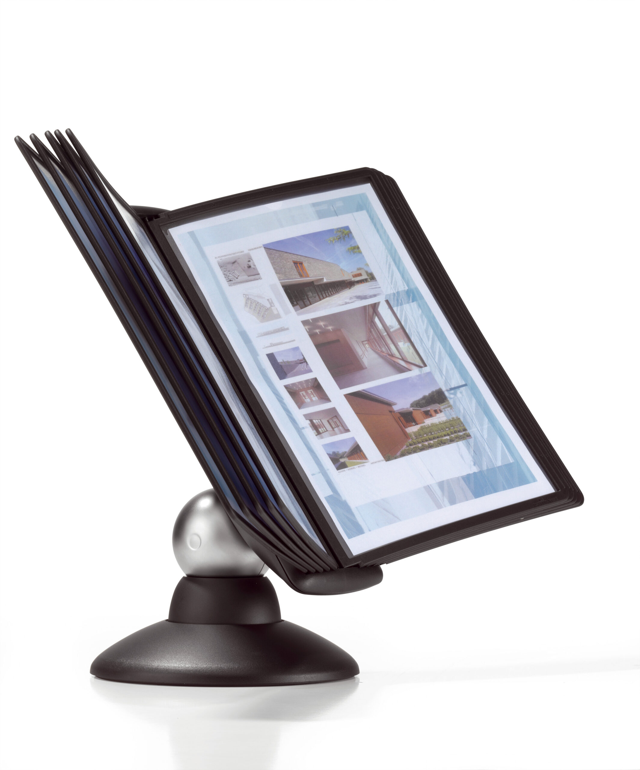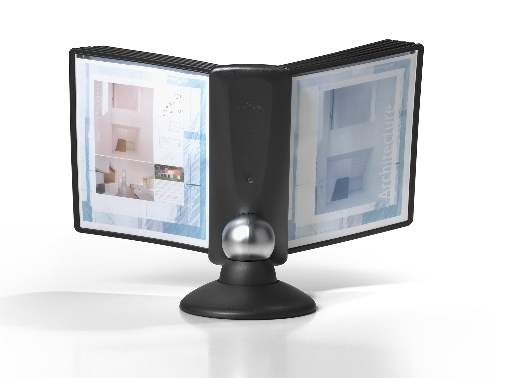 Roterende displaysystem med 10 stk. lommer A4. En galvaniseret bold forbinder konsollen der holder lommerne med foden, der giver 360 ° rotation. Læsning vinkel variabel fra 25 ° til 70 °. Oversigtsystemet er ideel til en bred vifte af applikationer: brug på arbejdspladsen når stående eller siddende, position mellem flere arbejdsstationer. Med etiketholder. 5 års garanti hvis produktet har en defekt som skyldes en fabrikationsfejl. https://www.durable.dk/service/durable-garanti/sherpavario-garanti.html