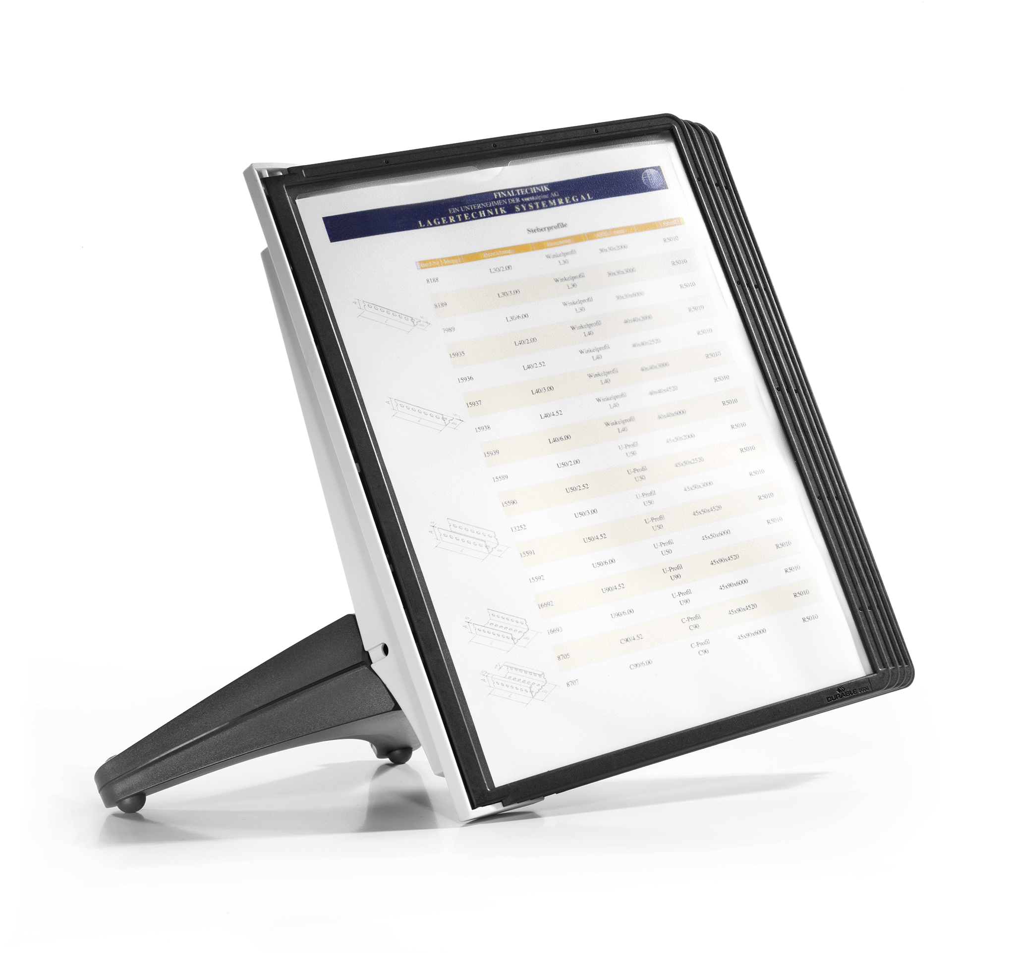 Pladsbesparende displaysystem med 5 stk. A4 lommer af refleksfri polypropylen plast samt etiketindstik, velegnet til den lille kontor eller hjemmekontoret. Det er nemt at skifte indhold i de miljøvenlige lommer. Den robuste fod giver en god stabilitet. 5 års garanti. Leveres med 5 stk. sorte lommer A5 i refleksfri polypropylen plast og etiketholder. 5 års garanti hvis produktet har en defekt som skyldes en fabrikationsfejl.https://www.durable.dk/service/durable-garanti/sherpavario-garanti.html
