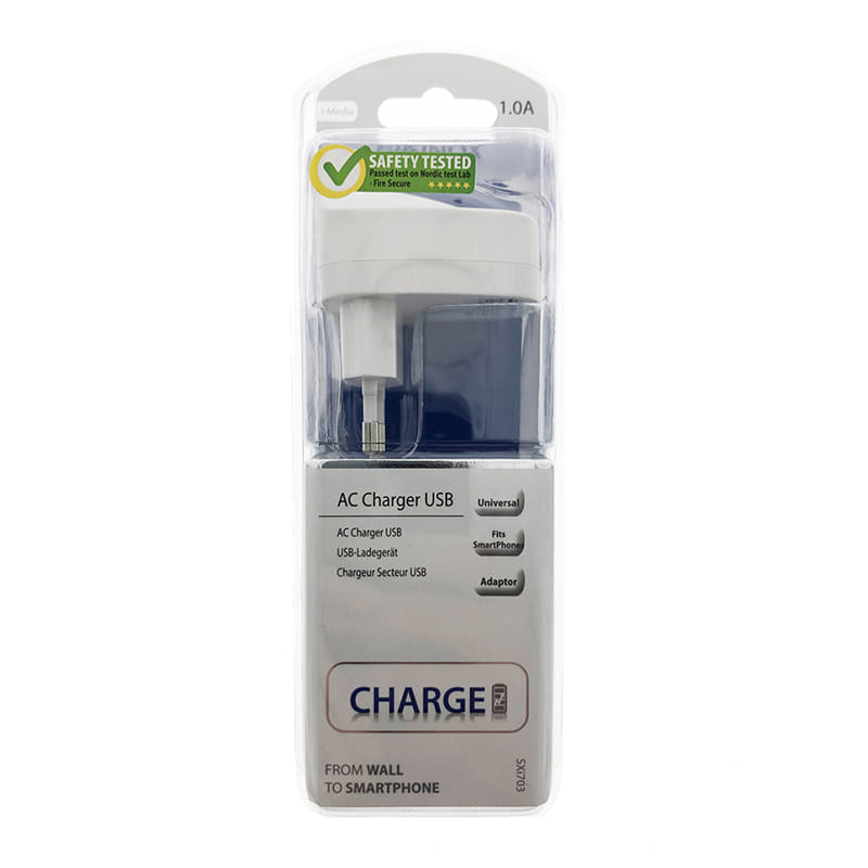 Sinox iMedia 230V USB oplader som kan bruges til at oplade din mobiltelefon, tablet og meget mere.