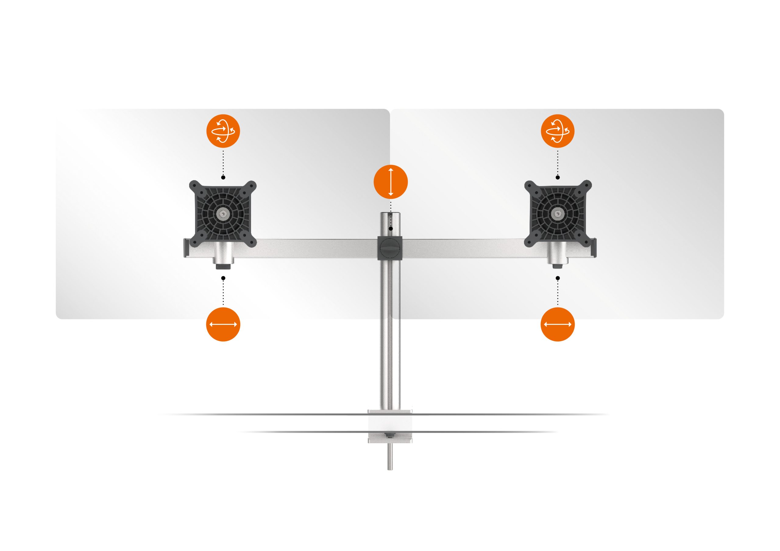 Skærmholder pro til 2 skærme, bordbeslagSkærmholder til 2 skærme med justerbar højde, rotation og hældning. Fastgørelse med bordbeslag