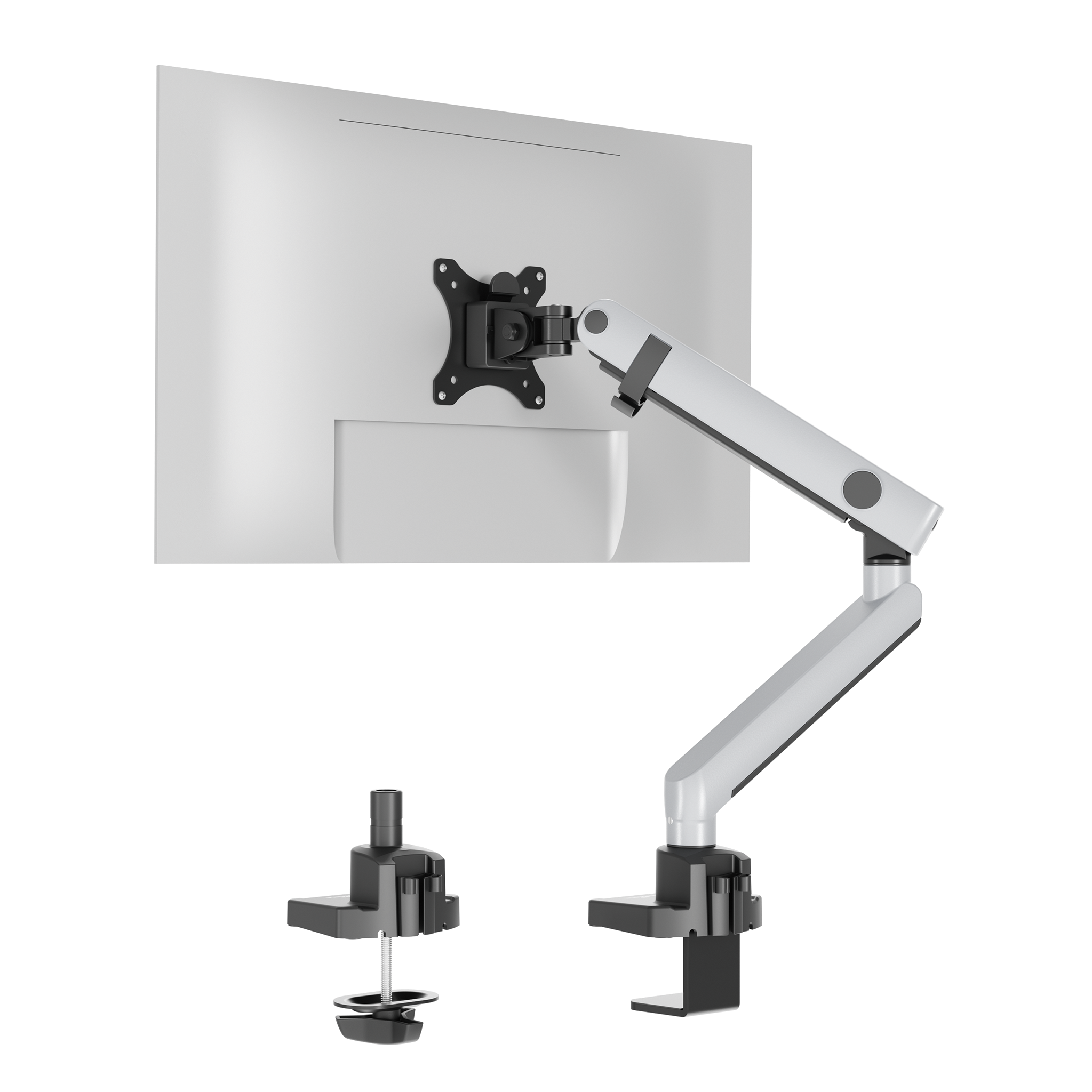 Skærmholder med fleksibel arm til 1 skærm, herunder mulighed for individuel montering ved hjælp af beslag til kabelgennemføring eller klemme beslag. Højde, hældning og position af skærmen kan justeres nemt og individuelt for at lette ergonomisk arbejde Kan drejes 90° for at arbejde i stående eller liggende tilstand Ubesværet positionering af armen i den ønskede position takket være individuel justering af fjederen Universel VESA-montering (75 x 75 mm eller 100 x 100 mm) Til standardskærme på op til 32″ og 8 kg Kabelstyring: Monitorkablet føres langs skærmholderen via interne kabelkanaler og en klemme, hvilket beskytter mod kabelbrud