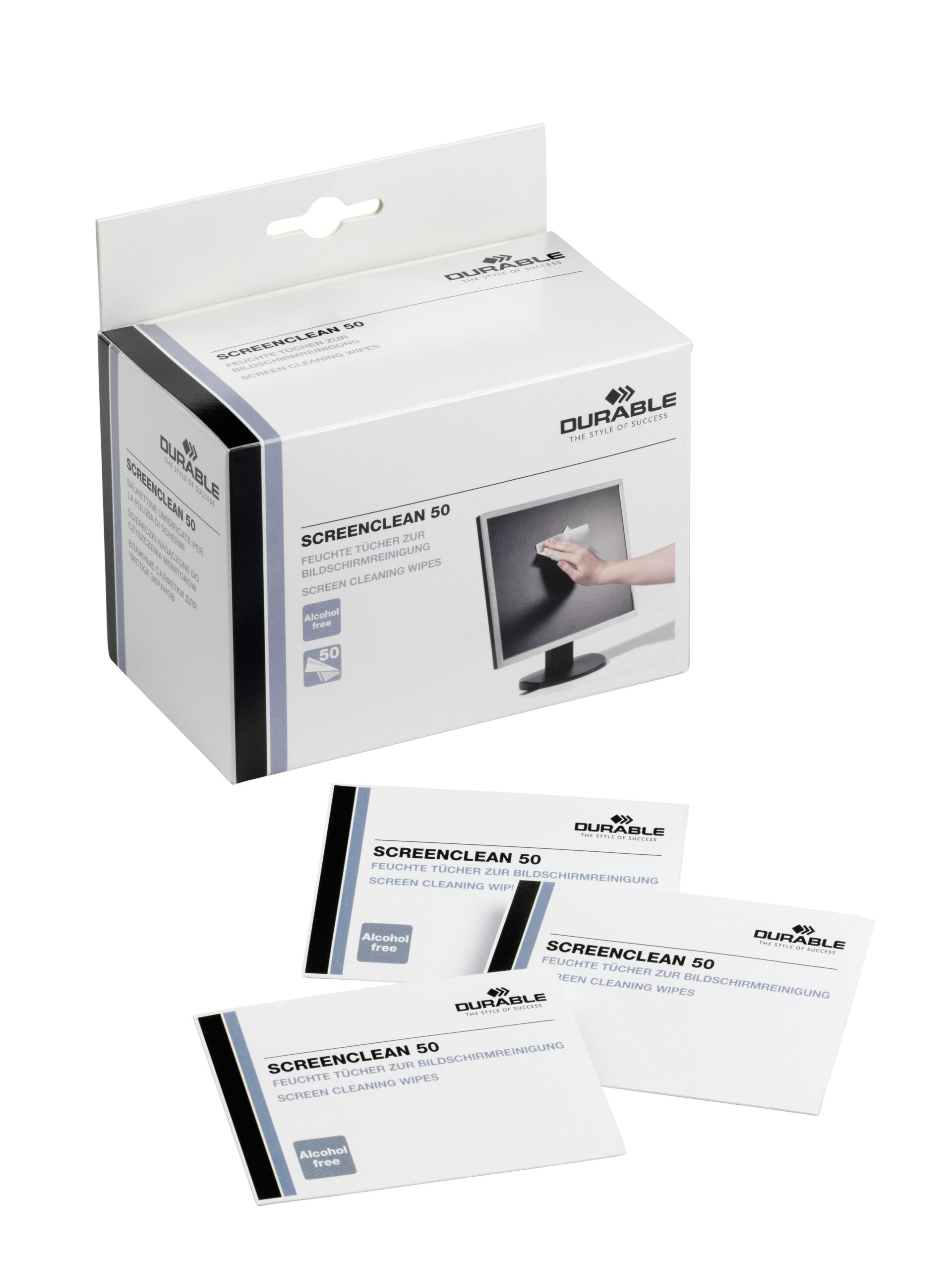50 stk. fugtige individuelt pakket renseservietter SCREENCLEAN til rengøring af skærme, bærbare computere og glasflader på kopimaskiner og scannere. Først renses med fugtig serviet og derefter tørres der efter med en tør serviet. Ideel til rejser. Har antistatisk virkning, er uden alkohol og er bionedbrydelig.
