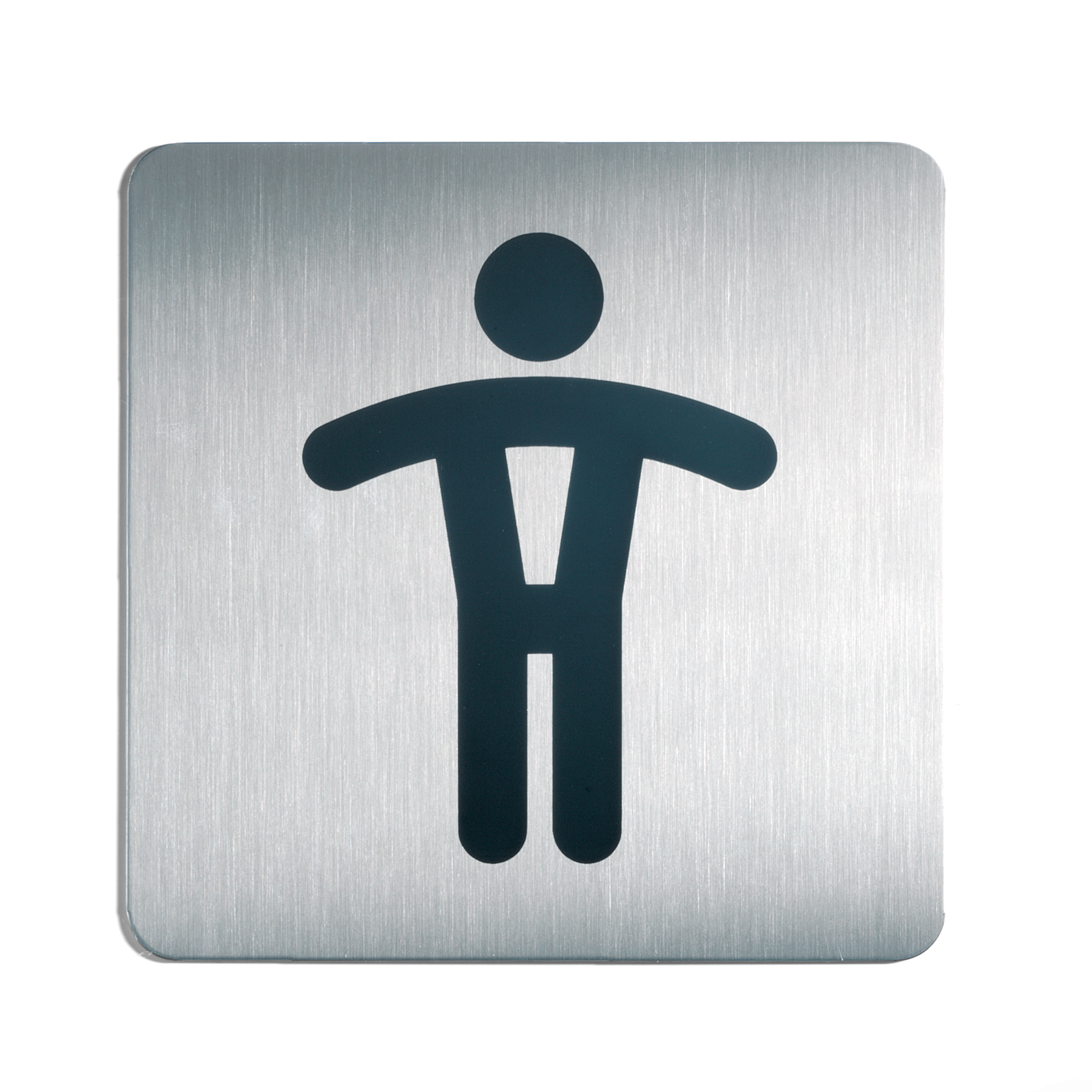 Firkantet skilt WC Herretoilet Symbolskilt af børstet rustfrit stål, der er ridsefri. Stort skilt synligt på hold. Selvklæbende puder medfølger. Mål: 150 x 150 mm