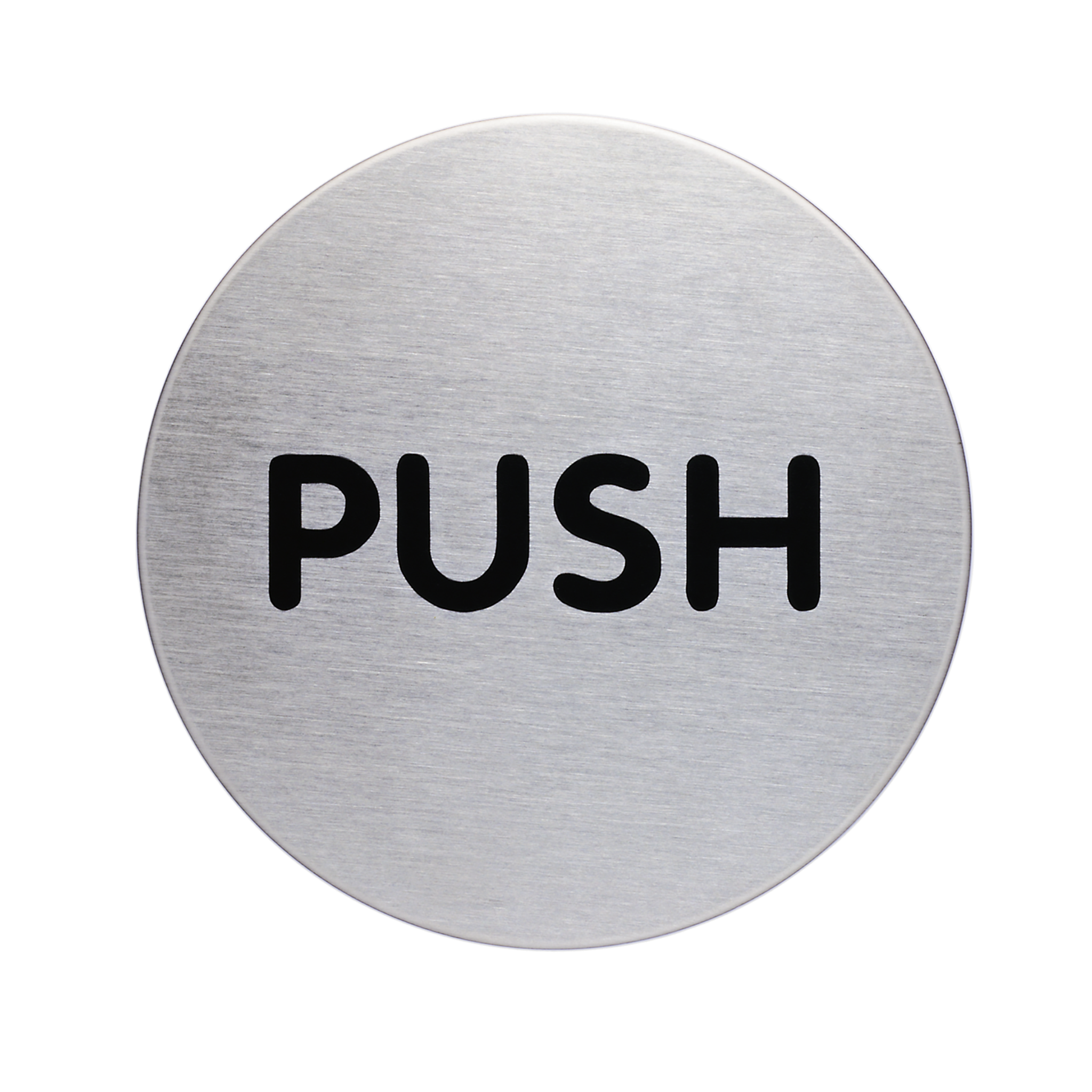 Fremstillet af børstet rustfrit stål i høj kvalitet Ridsefast og robust tryk Universelt og letforståeligt skilt Kan fastgøres på mange forskellige overflader vha. den medfølgende klæbepude Motiv: PUSH