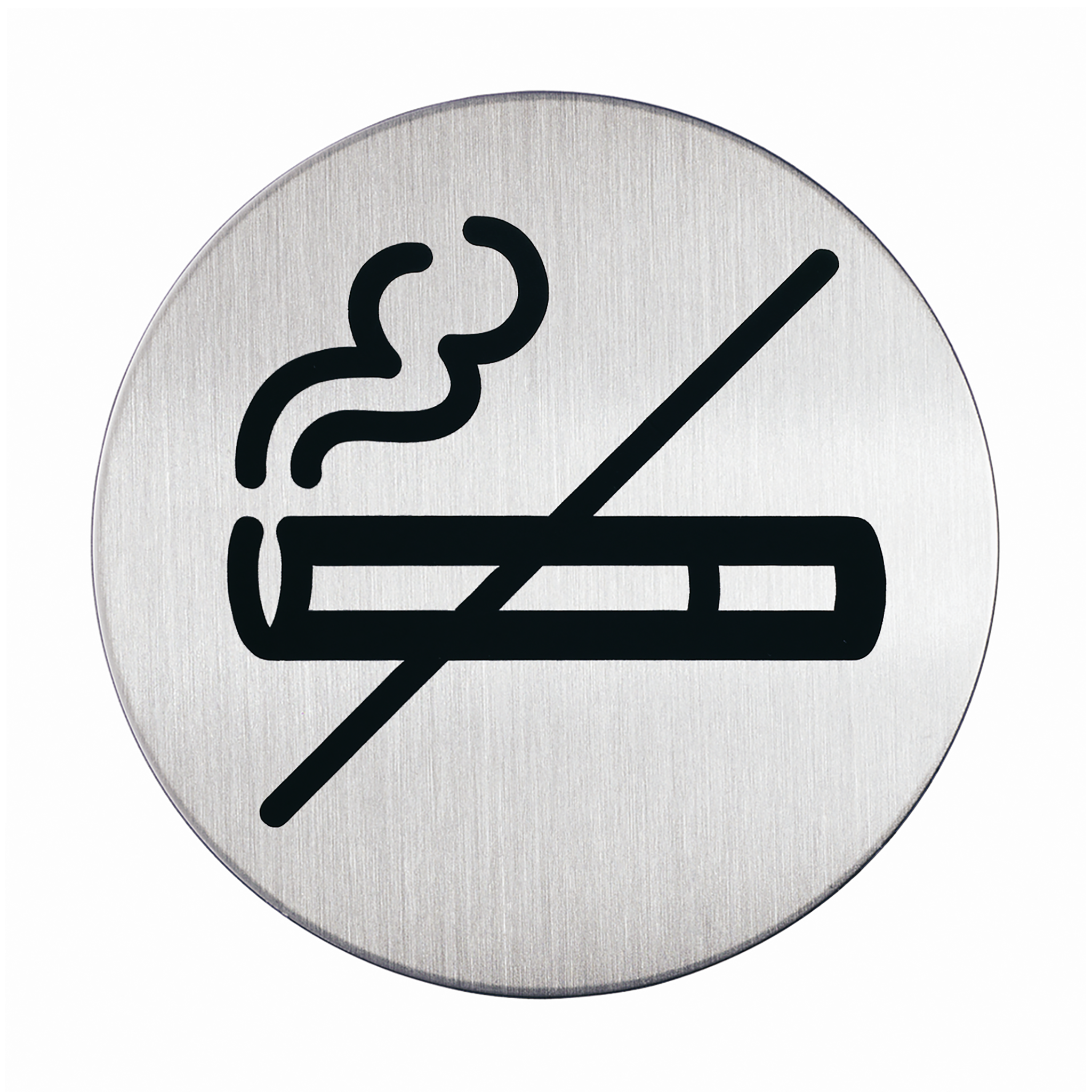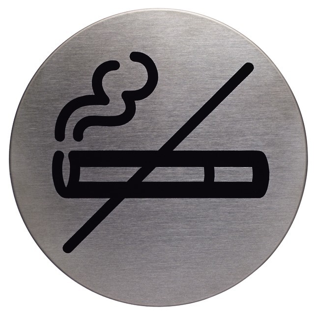 Rund skilt Rygning forbudt Symbolskilt af børstet rustfrit stål, der er ridsefri. Selvklæbende puder medfølger. Ø 83 mm