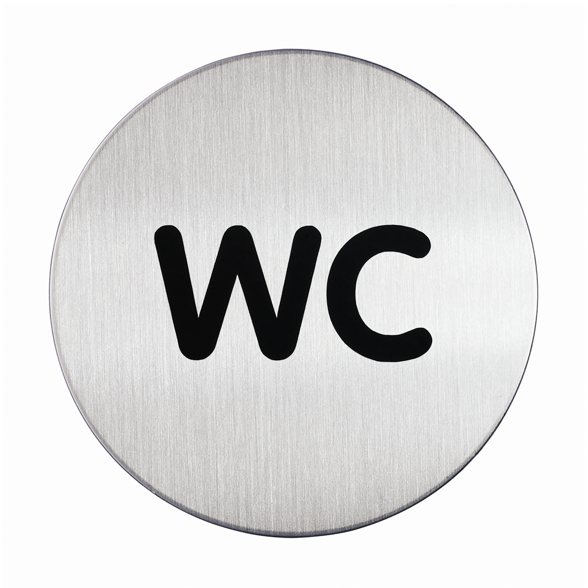 Rund skilt “WC” til toilet Symbolskilt af børstet rustfrit stål, der er ridsefri. Selvklæbende puder medfølger. Ø 83 mm