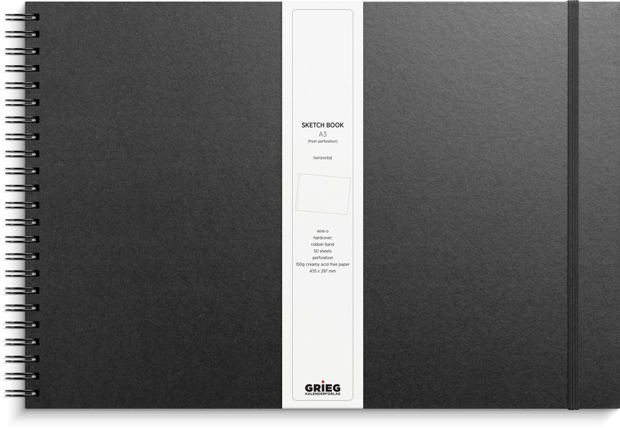 Skitseblok med hårdt kunstskindsomslag, elastik. Syrefrit papir. Cremefarvet, ulinjeret, 150 g, 50 blade. Spiralindbundet. papirformat efter perforering: A3L
