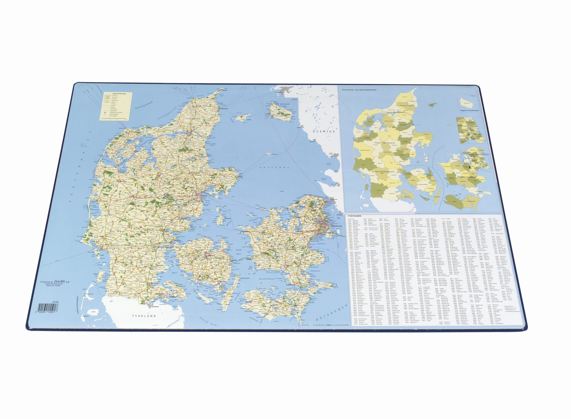 Skriveunderlag med Danmarkskort og oversigt over postnumre. Skriveunderlaget har en refleksfri overflade.