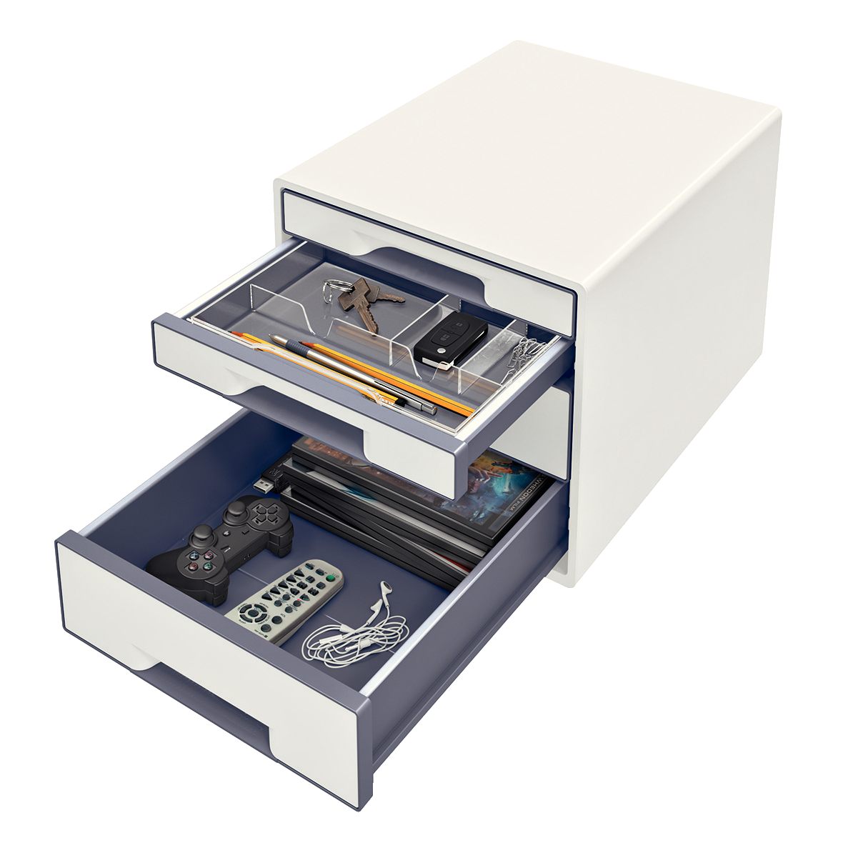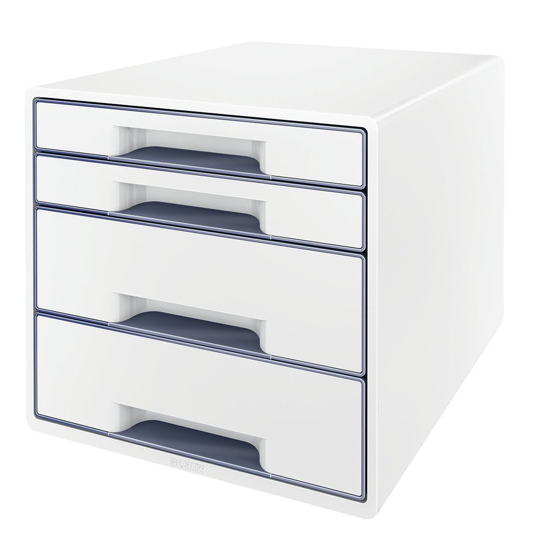 4 skuffer (2 store og 2 små). Iøjnefaldende og stilfuld i WOW tofarvet effekt med højglans. Robust og holdbar. A4 maxi.