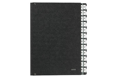 Denne sorteringsmappe fra Leitz er inddelt fra 1-31. Den har plastfaner med udskiftelige labels og 6 indvendige huller. Designet er enkelt med sorte omslag og sider. Sorteringsmappen er lavet af hårdt, kraftigt karton.