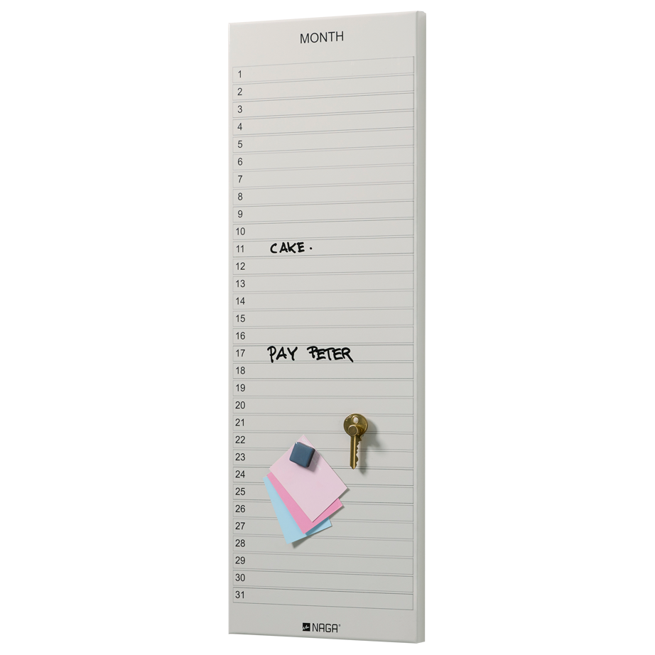 Magnetisk månedsplan tavle 20 x 60 cm. Beige Engelsk Få styr på månedens aftaler med denne praktiske og stilrene månedsplan tavle i beige. Tavlen er inddelt med 31 nummererede linjer, så du nemt kan genbruge tavlen måned efter måned. Teksten er på engelsk. Overfladen er fremstillet i stål og dækket af en lamineret folie, som gør tavlen både magnetisk og skrivevenlig. Du kan skrive på tavlen med en whiteboard- eller glastavle marker og let viske ud igen. En sort marker medfølger. Brug tavlen til at holde styr på fødselsdage, vigtige deadlines eller begivenheder og skab ro i hverdagen med ét samlet overblik. Du kan også bruge helt almindelige køleskabsmagneter til at fastgøre noter eller kvitteringer. Månedsplan tavlen måler 20 x 60 cm og passer perfekt i hjemmet, på kontoret eller i fællesrum. Tavlen har to huller på bagsiden og monteres nemt på væggen med to skruer (skruer medfølger ikke).