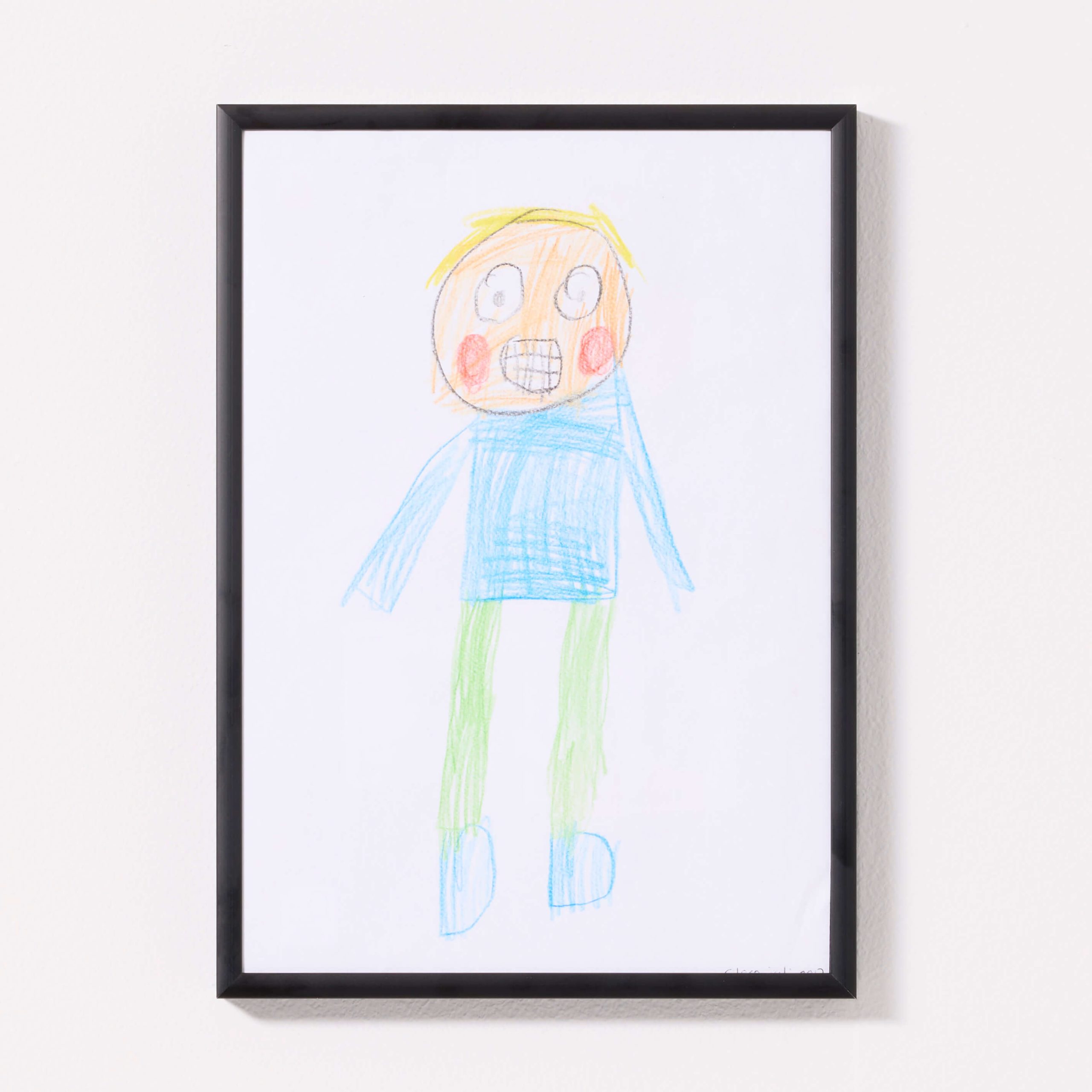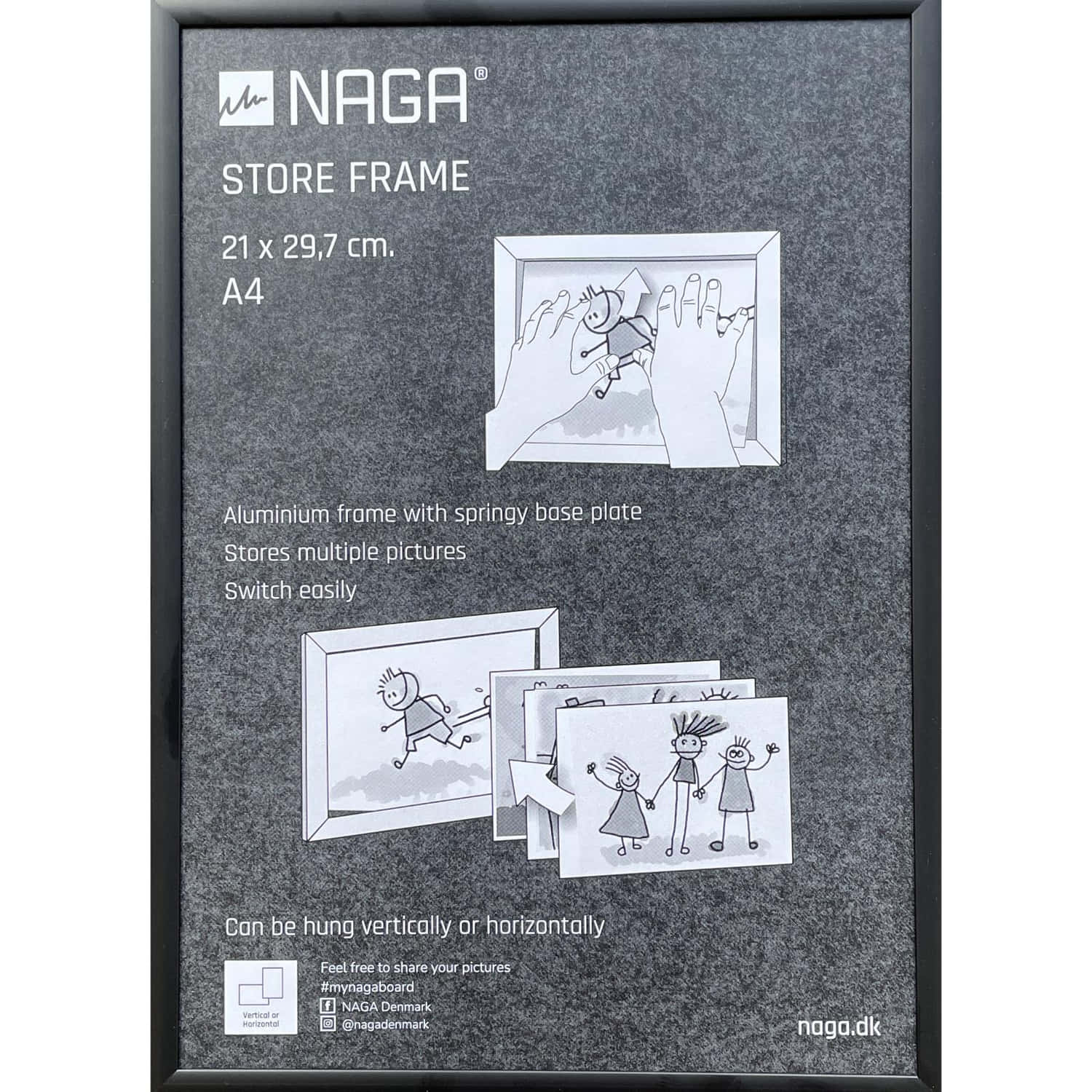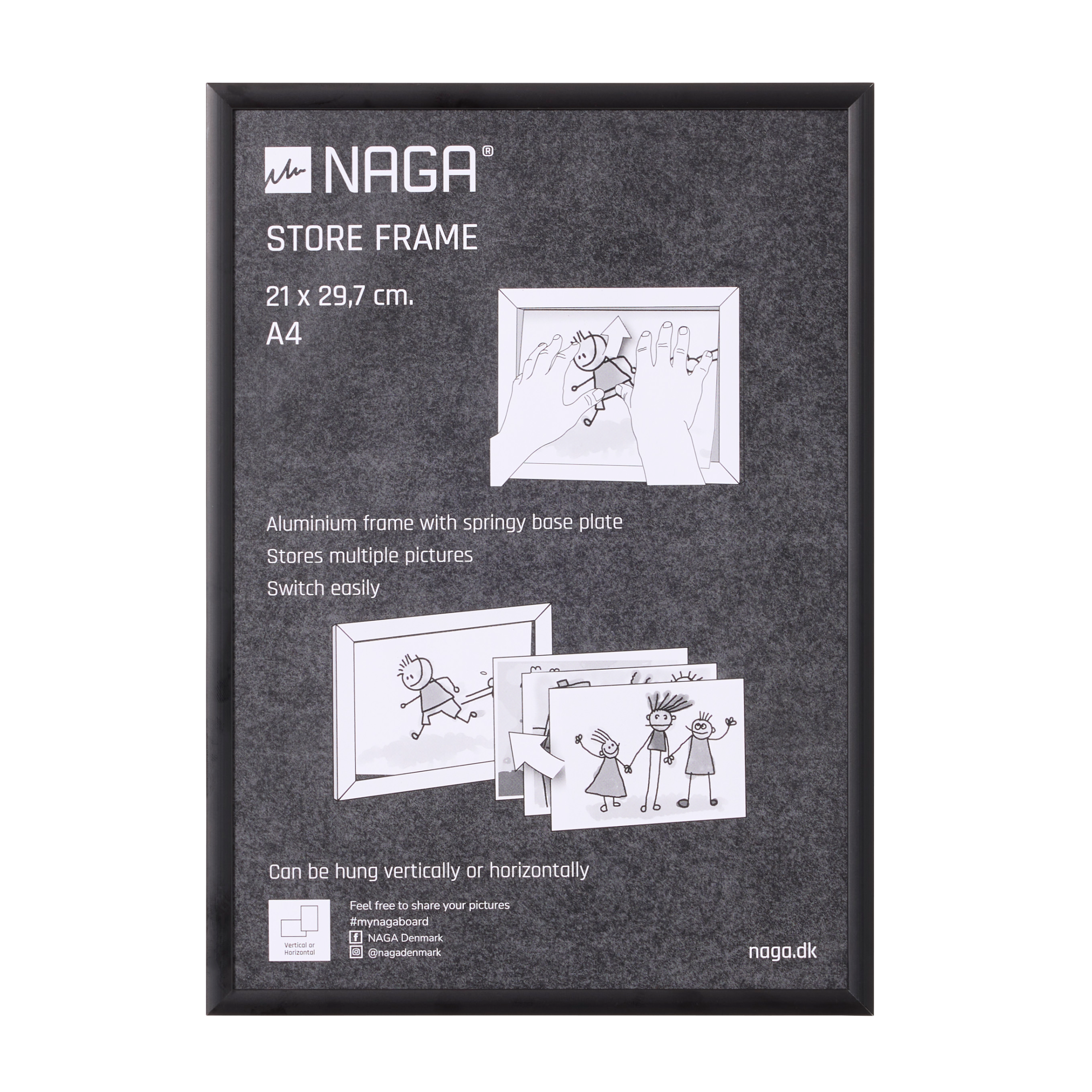 Ramme til tegninger, A4, sort Hvis du leder efter en enkel og stilfuld måde at fremvise børnetegninger på, er denne ramme til tegninger det perfekte valg! Rammen har ingen glas, så det er let at udskifte børnetegningerne. Hold blot tegningen op til rammen og tryk den forsigtigt ind i hjørnerne – så er tegningen indrammet og klar til at blive vist frem. Næste gang børnene kommer med en ny tegning, kan du nemt placere den ovenpå de gamle, uden at tage rammen ned fra væggen. Rammen er ikke kun god til børnetegninger, men kan med fordel også bruges i professionelle sammenhænge. Den er perfekt til kantiner, hvor ugens menu nemt kan skiftes ud, eller til mødelokaler, hvor den kan bruges til at vise en oversigt over dagens møder. Enkel, praktisk og lige til at bruge. Rammen kan både hænge lodret eller vandret. Rammen passer til A4 papir og er fremstillet i sort aluminium. Mål: 21 x 29,7 cm.