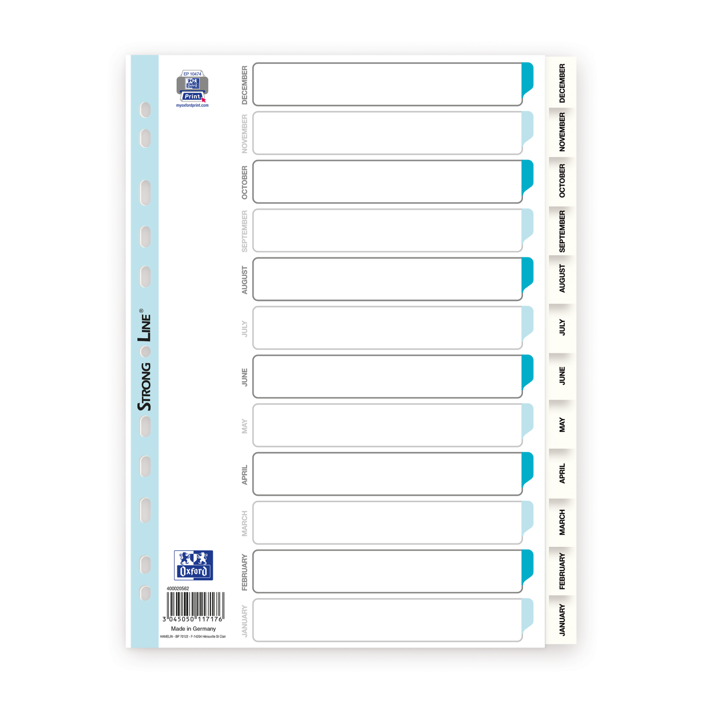 lavet af robust 0,12 mm stærk polypropylenfolie. Månedlige faner dec-jan. StrongLine® hulforstærkning. A4.