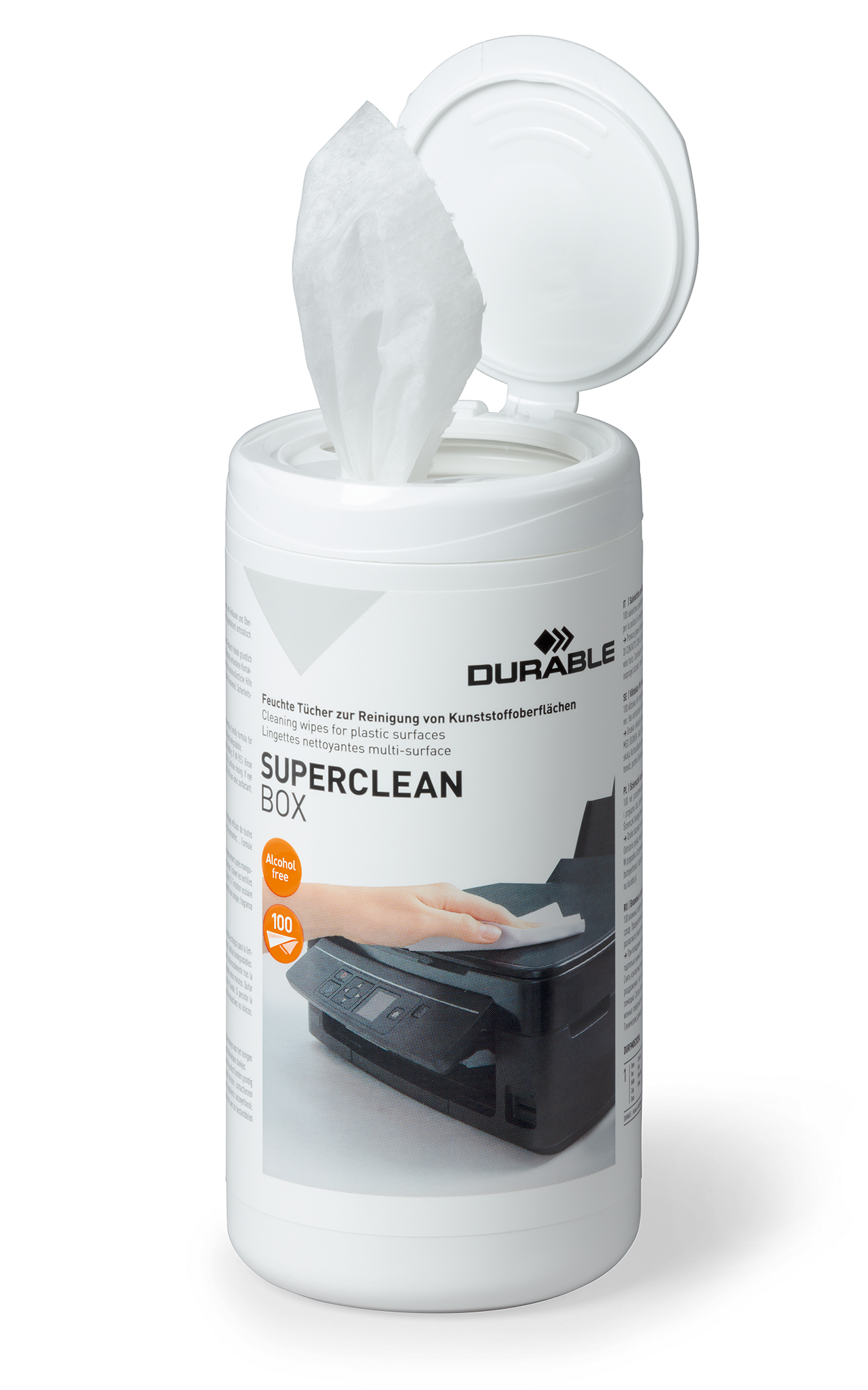 Genopfyldelige beholder, indeholder 100 fugtige renseservietter SUPERCLEAN. Til rengøring af plastoverflader såsom computere, printere, telefoner og andet kontorudstyr. Har antistatisk virkning, uden alkohol og den er bionedbrydelig.