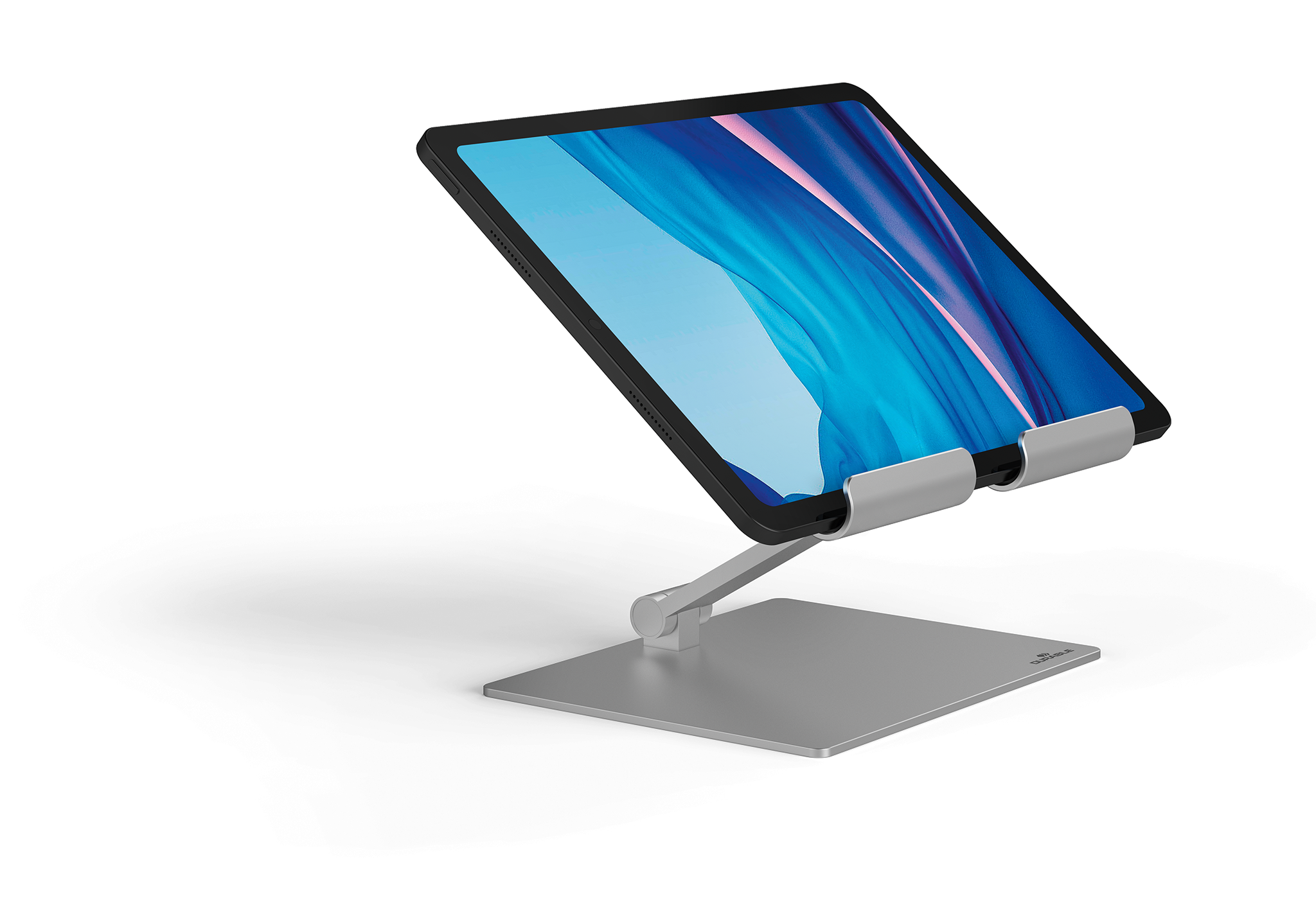 Mere digitalt hjemmearbejde, virtuel læring og et stigende medieforbrug har øget brugen af tablets. En tabletholder gør brugen mere praktisk og ergonomisk, f.eks. på Teams møder, plejehjem for at holde kontakten med dine kære, digitale magasiner, sociale medier eller på rejser. Tablet Stand RISE er et foldbart bordstativ som passer til tablets på op til 13″ med en maksimal vægt på 1 kg. Fremstillet af op til 40 % genanvendt 3,5 mm tykt aluminium. 100% genanvendelig. Placeres i holderen i stående eller liggende format. Trinløs justering af højde og læsevinkel. Gummipuder og stopkant forhindrer tabletten i at glide ud af stativet. Gummipuder på undersiden beskytter bordets overflade mod ridser og holder stativet stabilt. Mål sammenfoldet: H 47 x B 170 x D 155 mm. Pladen, som tabletten hviler på, er 170 x 155 mm, bordpladen 170 x 137 mm, og armen er 130 mm