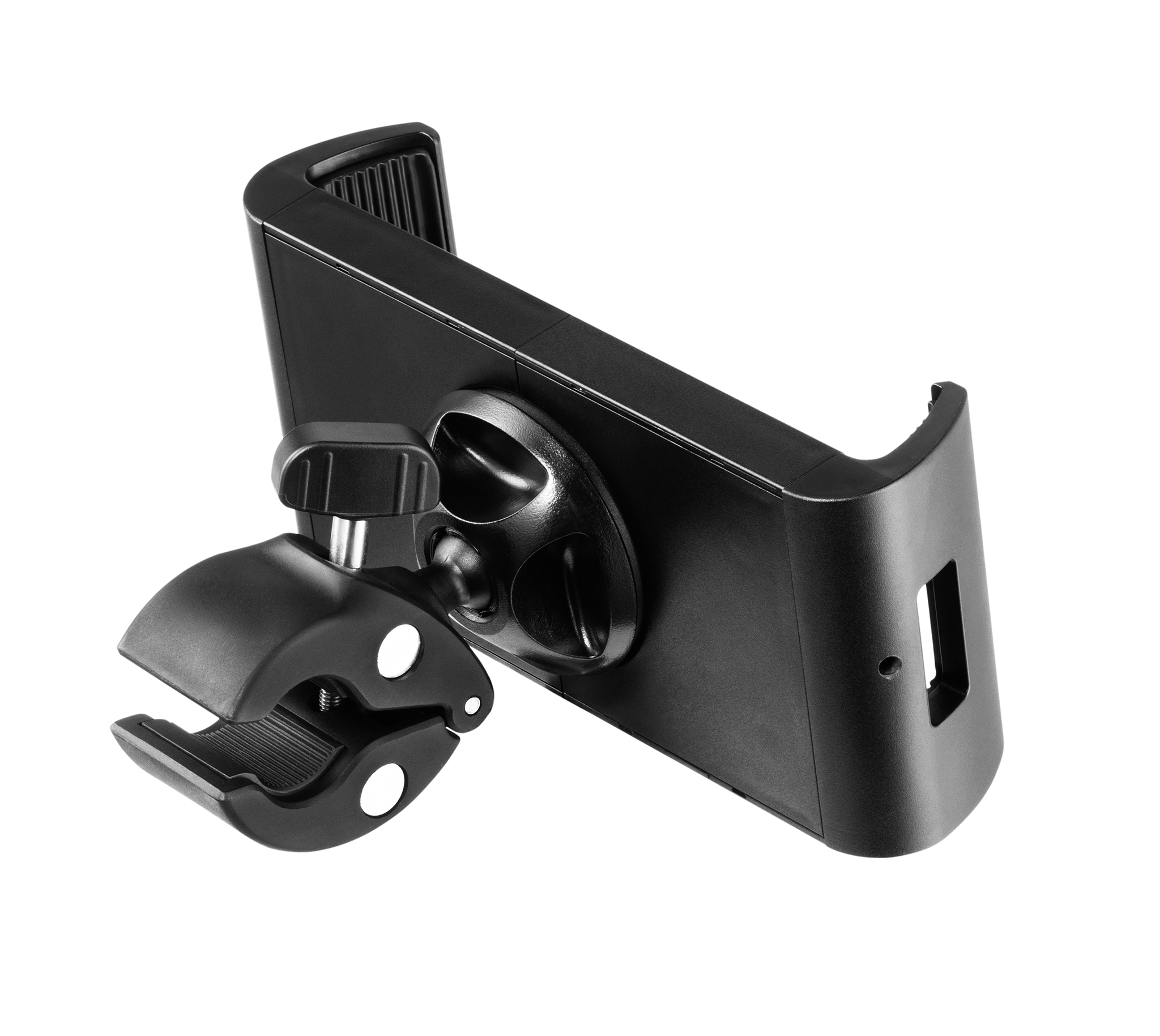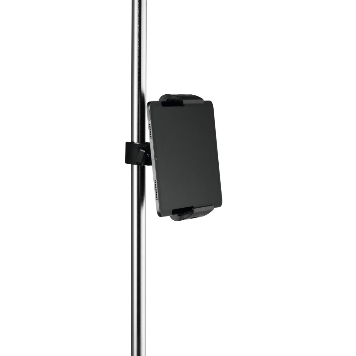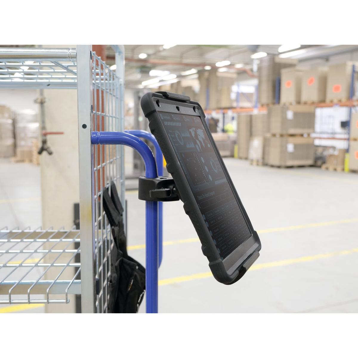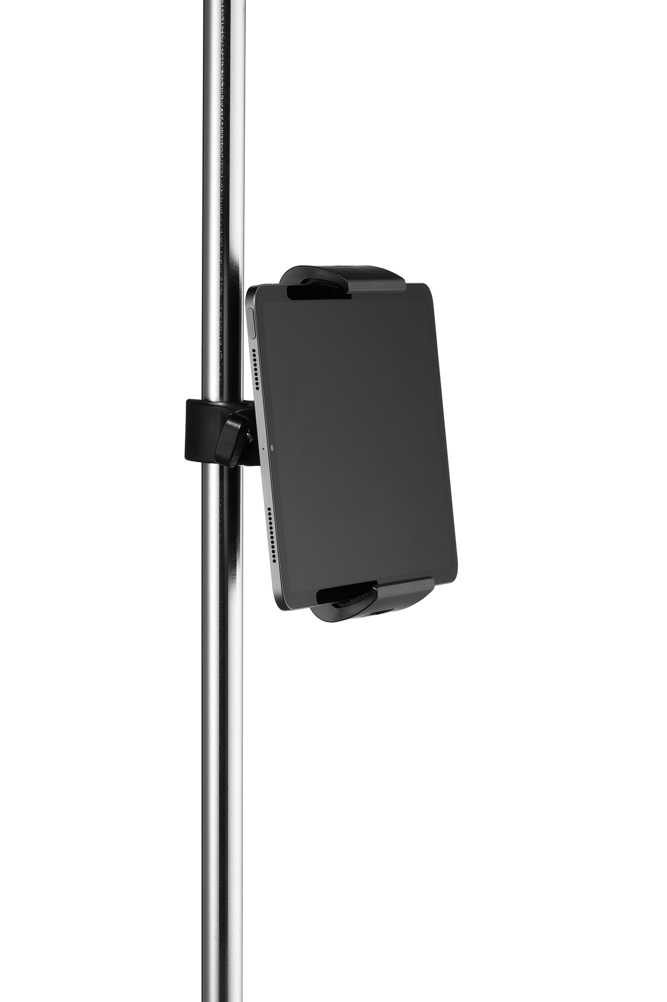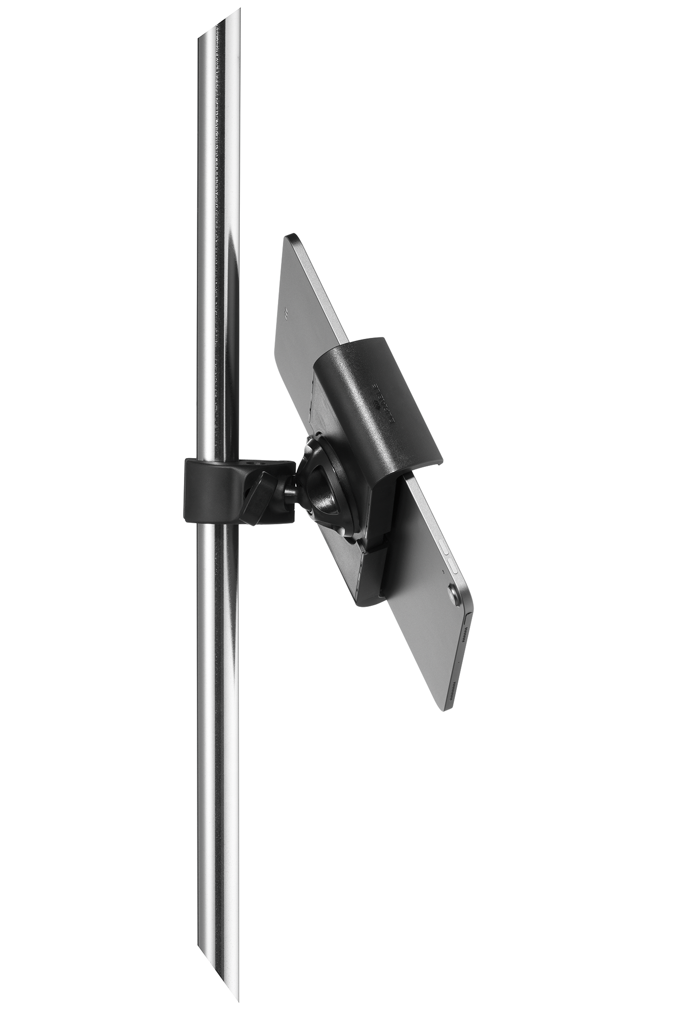 Tabletholder, som kan monteres på hylder (maks. 40 mm) eller rør og stænger (Ø 15-40 mm), f.eks. på håndtaget til en rengørings- eller lagervogn. Passer til tablets med eller uden cover i størrelsen 7″-13″ (160-275 mm) med en tykkelse på maks. 23 mm. Til instruktioner, arbejdsplaner og andet i industrien, produktionsanlæg, rengøringsfirmaer m.fl. Holderen, med gummibelagte overflader, der beskytter tabletten mod ridser og skader, kan drejes 360°. Maksimal vægt for tabletten er 1 kg. Mål: 130 x 177 x 82 mm (B x H x D).