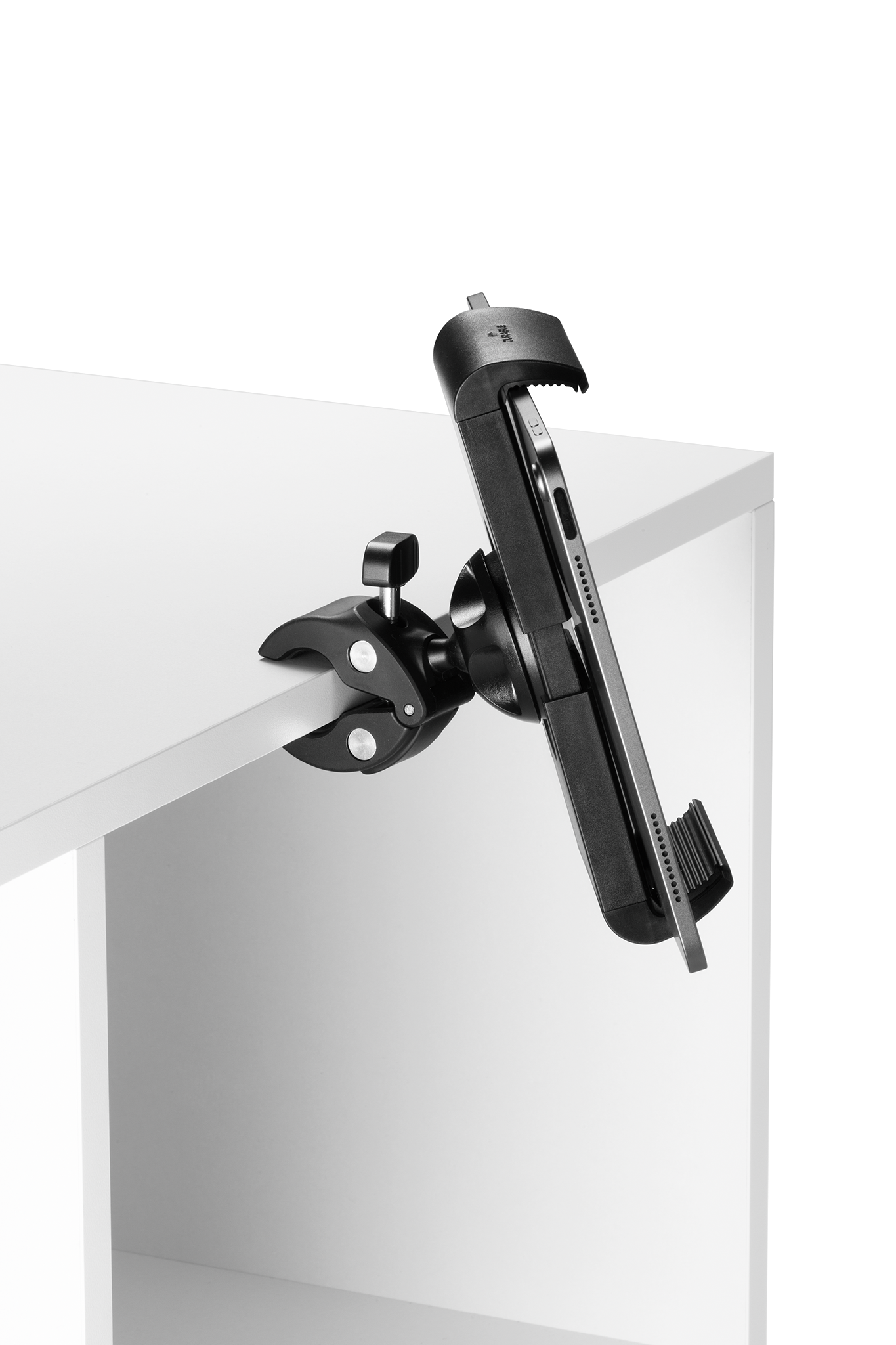 Tablet holder tough clampTabletholder med beslag til hylder eller en stang. Passer til tablets fra 7-13″ med eller uden beskyttende cover. Med fleksibel svanehals og kugleled.