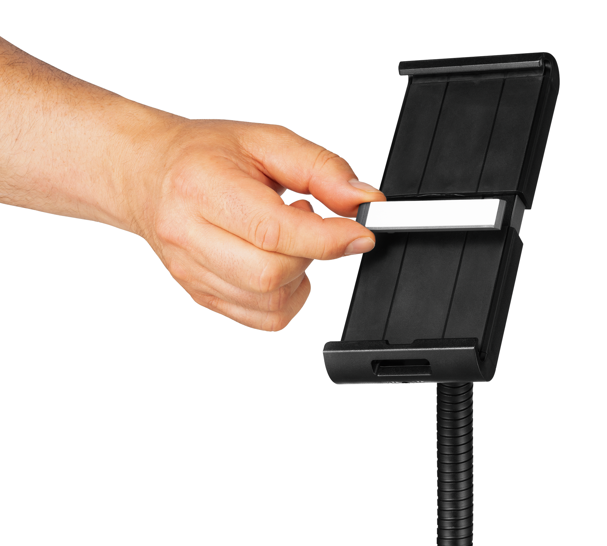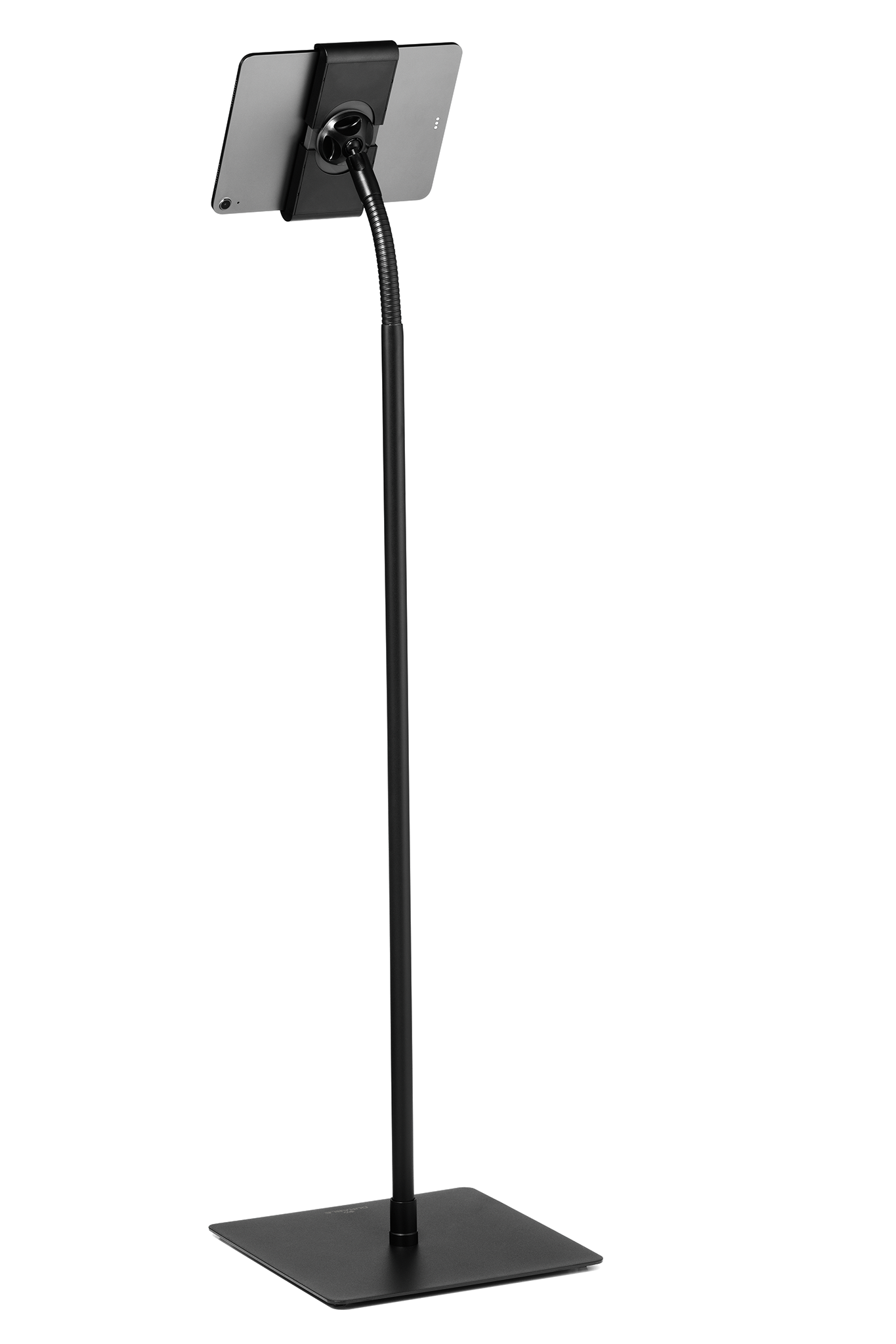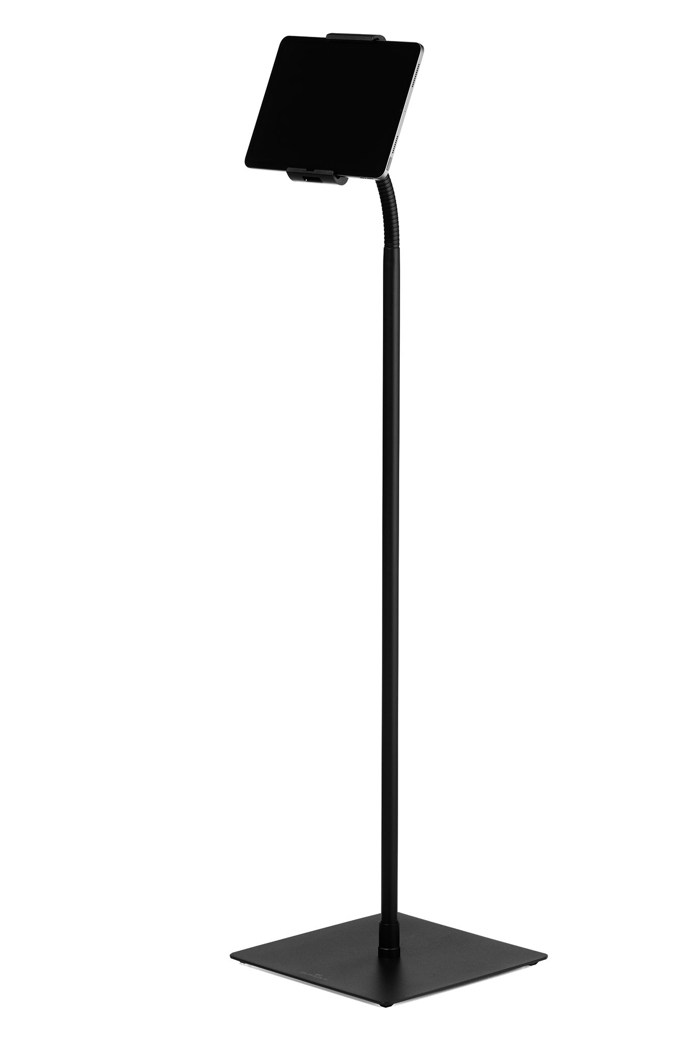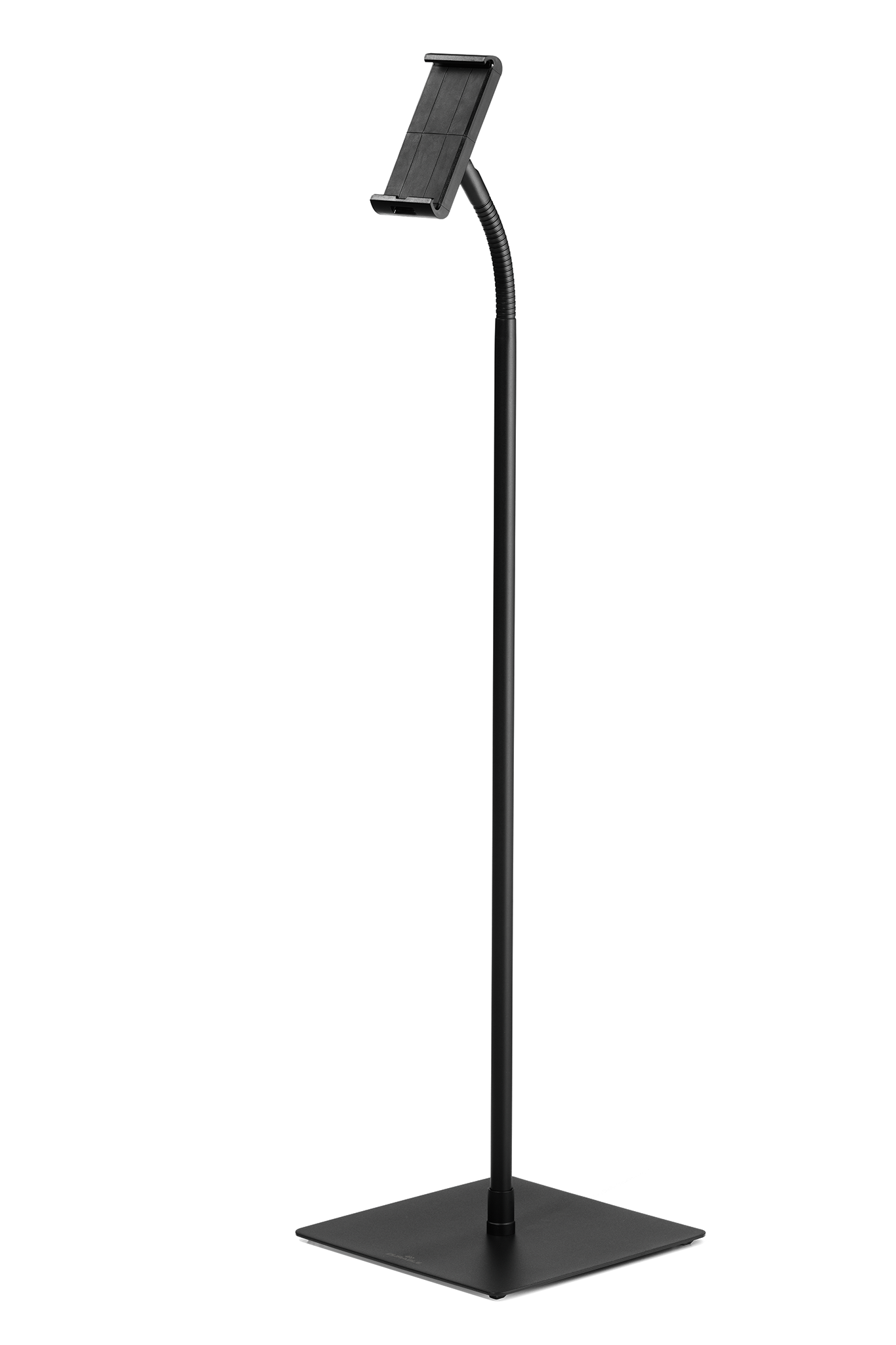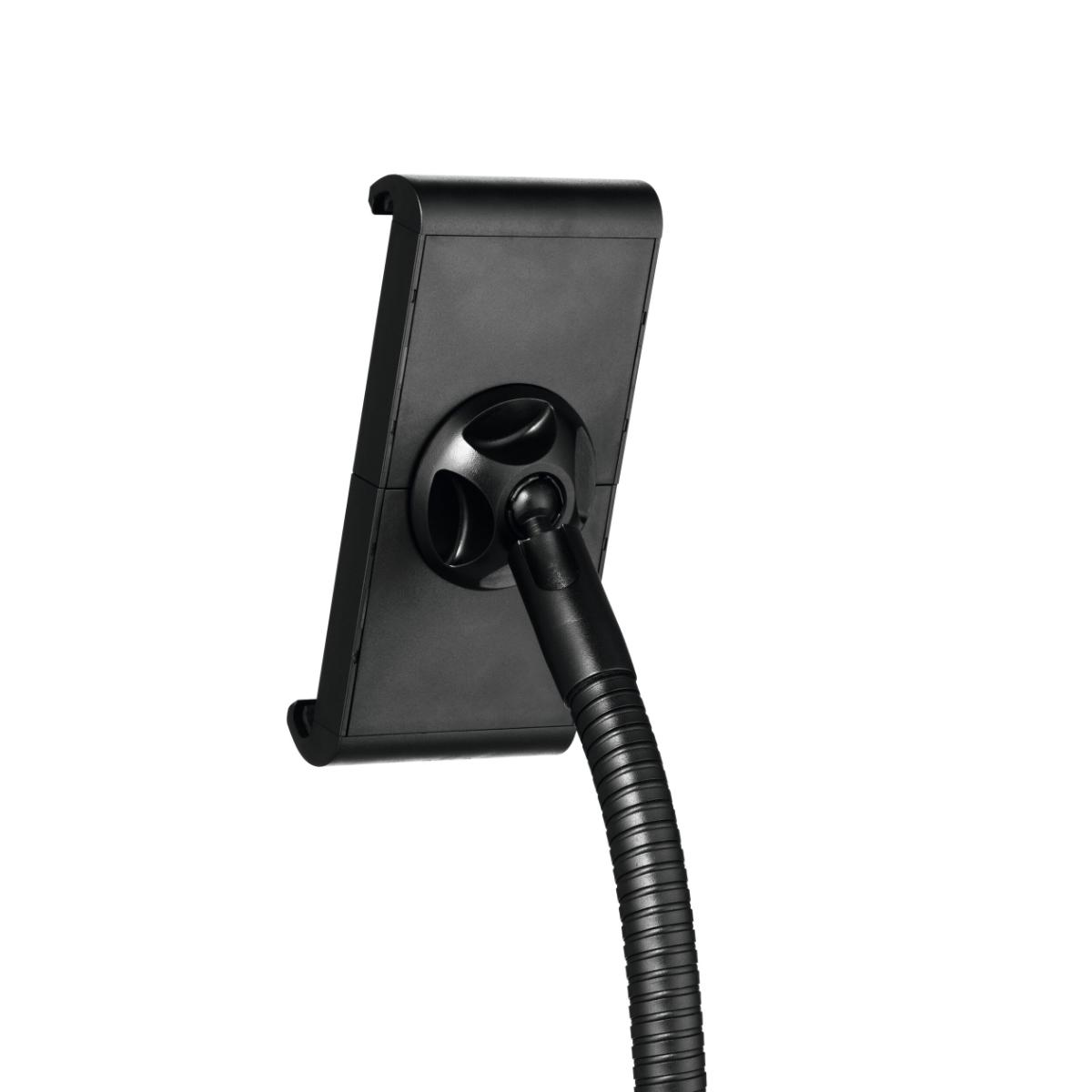 Tabletholder TOUGH FLOOR er et gulvstativ med holder til tablets i størrelsen 7″-13″ (160-275 mm) med en tykkelse på maks. 8 mm. Til informationsdeling og præsentationer i butikker, receptioner, salgs- og udstillingslokaler. Fremstillet af flammehæmmende materiale ( i henhold til DIN EN 45545-2 ). Holderen, med gummibelagte overflader, som beskytter tabletten mod ridser og skader, kan drejes 360°. Ergonomisk takket være den fleksible svanehals, som muliggør individuel og trinløs højdejustering. Tabletten er nem at sætte i og tage ud af holderen, som låses med en særlig nøgle for at forhindre tyveri. Derudover kan hele bordstativet låses fast med et eksternt kabellås “Minisaver mobile lock” fra Kensington. Opladerkablet tilsluttes gennem en åbning i holderen. Maksimal vægt for tabletten er 1 kg. Stativets maksimale højde er 1180 mm. Mål: 305 x 1180 x 305 mm (B x H x D).