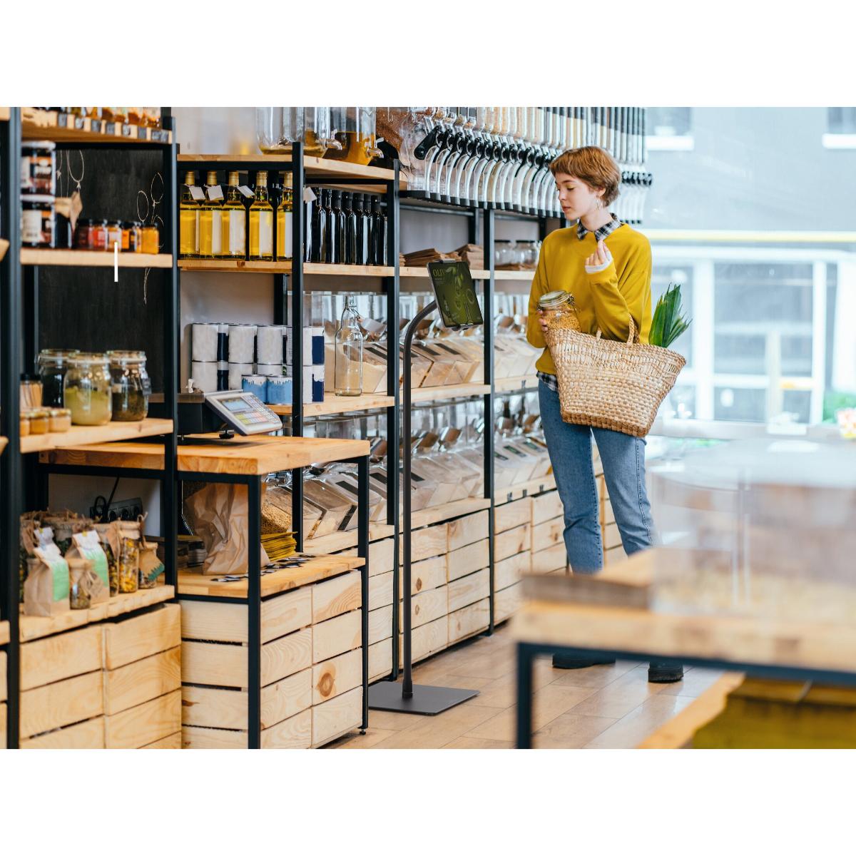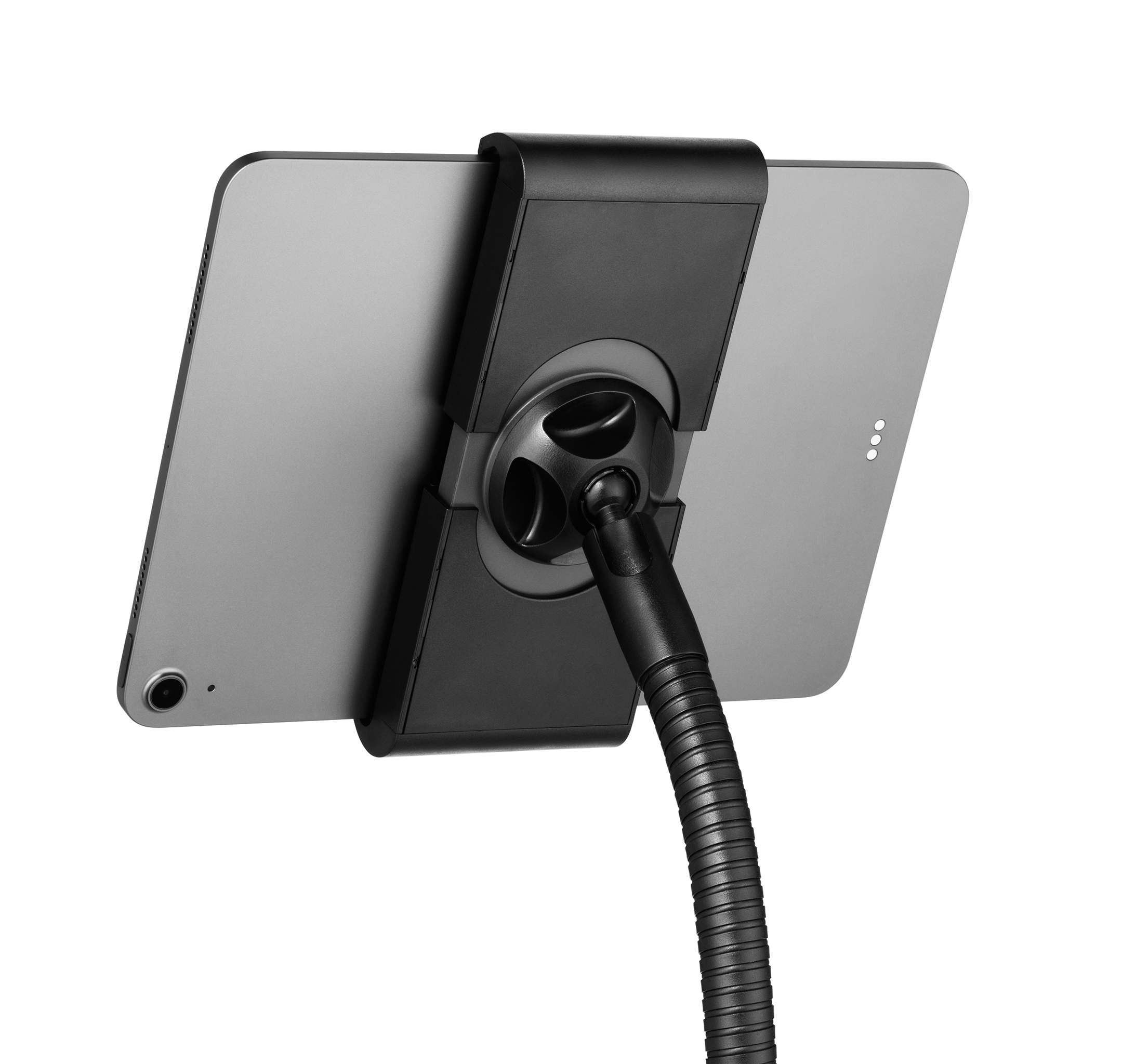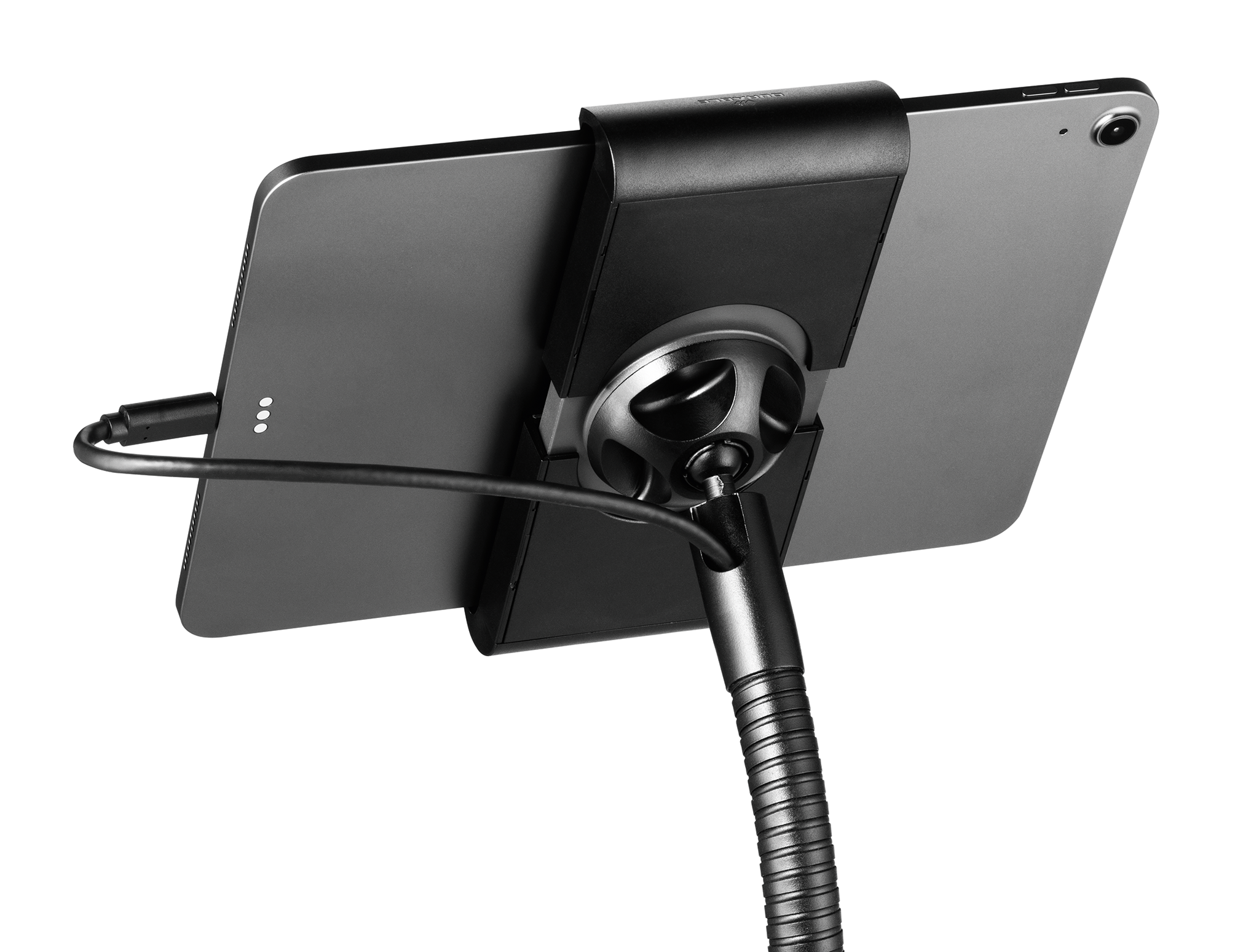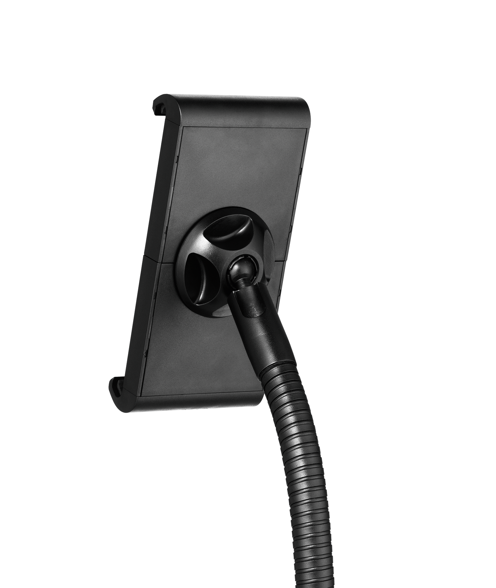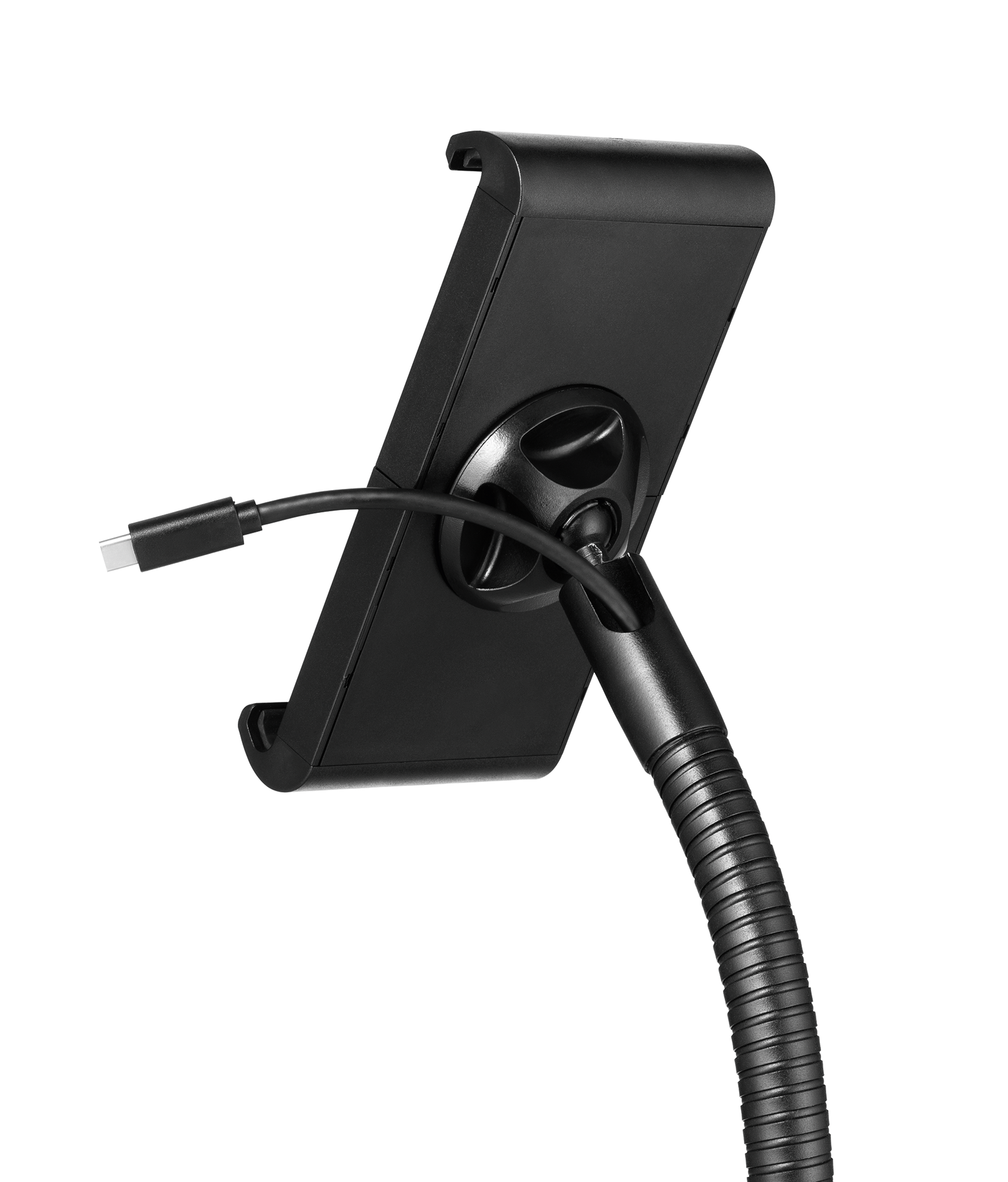 Tabletholder TOUGH FLOOR er et gulvstativ med holder til tablets i størrelsen 7″-13″ (160-275 mm) med en tykkelse på maks. 8 mm. Til informationsdeling og præsentationer i butikker, receptioner, salgs- og udstillingslokaler. Fremstillet af flammehæmmende materiale ( i henhold til DIN EN 45545-2 ). Holderen, med gummibelagte overflader, som beskytter tabletten mod ridser og skader, kan drejes 360°. Ergonomisk takket være den fleksible svanehals, som muliggør individuel og trinløs højdejustering. Tabletten er nem at sætte i og tage ud af holderen, som låses med en særlig nøgle for at forhindre tyveri. Derudover kan hele bordstativet låses fast med et eksternt kabellås “Minisaver mobile lock” fra Kensington. Opladerkablet tilsluttes gennem en åbning i holderen. Maksimal vægt for tabletten er 1 kg. Stativets maksimale højde er 1180 mm. Mål: 305 x 1180 x 305 mm (B x H x D).