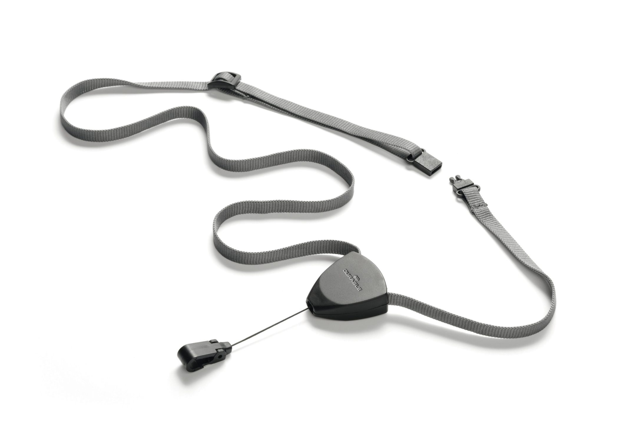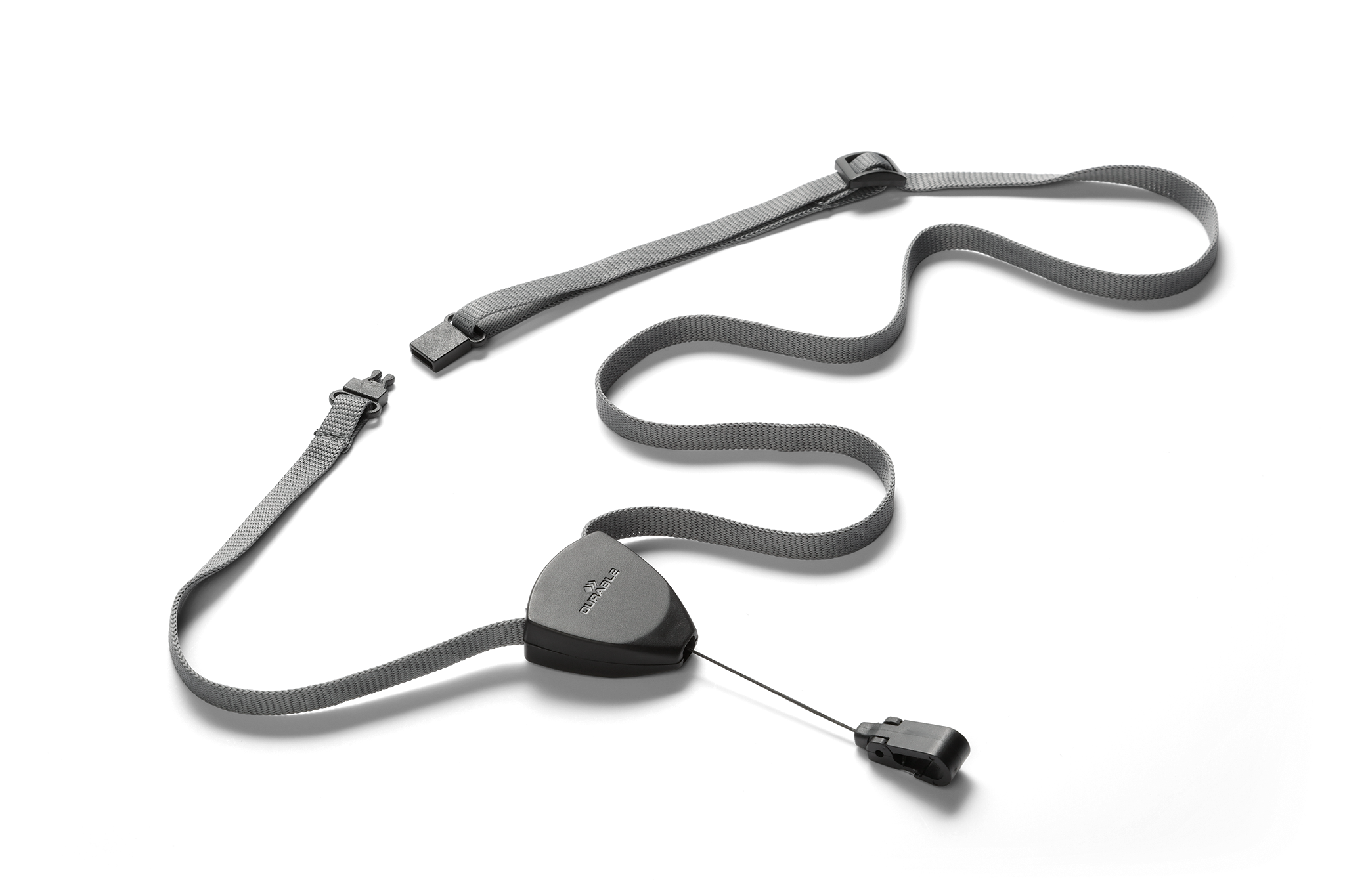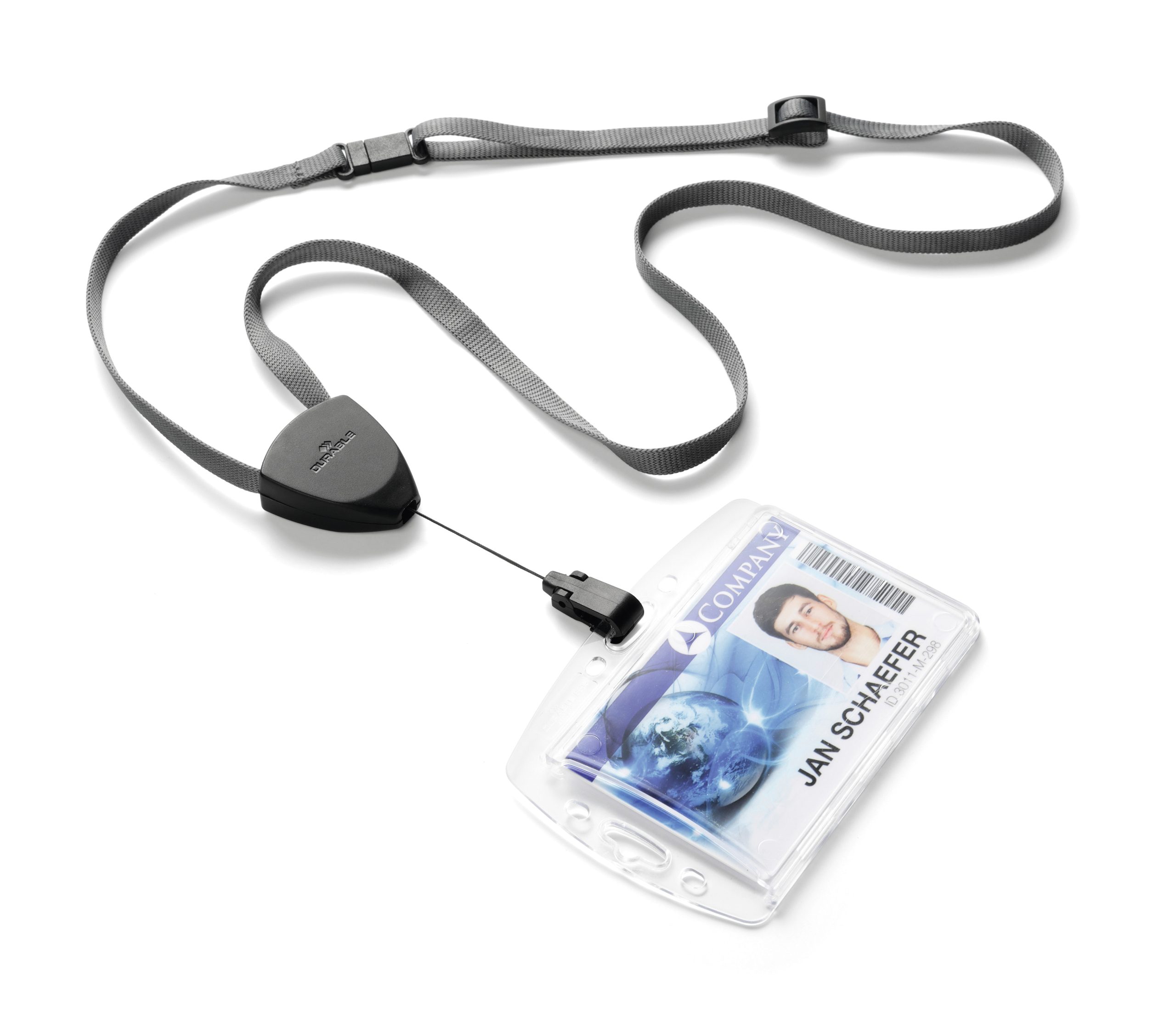 Halssnor af silkeagtig stof med sort trekantet yoyo med sikkerhedslås, og sikkerhedsudløser, der åbner, hvis halssnor bliver fanget. Kan justeres i længden mellem 240 og 500 mm. Den brede krog af robust ABS plast passer til alle Durable kortholdere. Mål halssnor: Maksimal længde 500 mm, bredde 8 mm. Mål yoyo: Udvidelse en maksimal længde på 800 mm, krogen bredde 9 mm