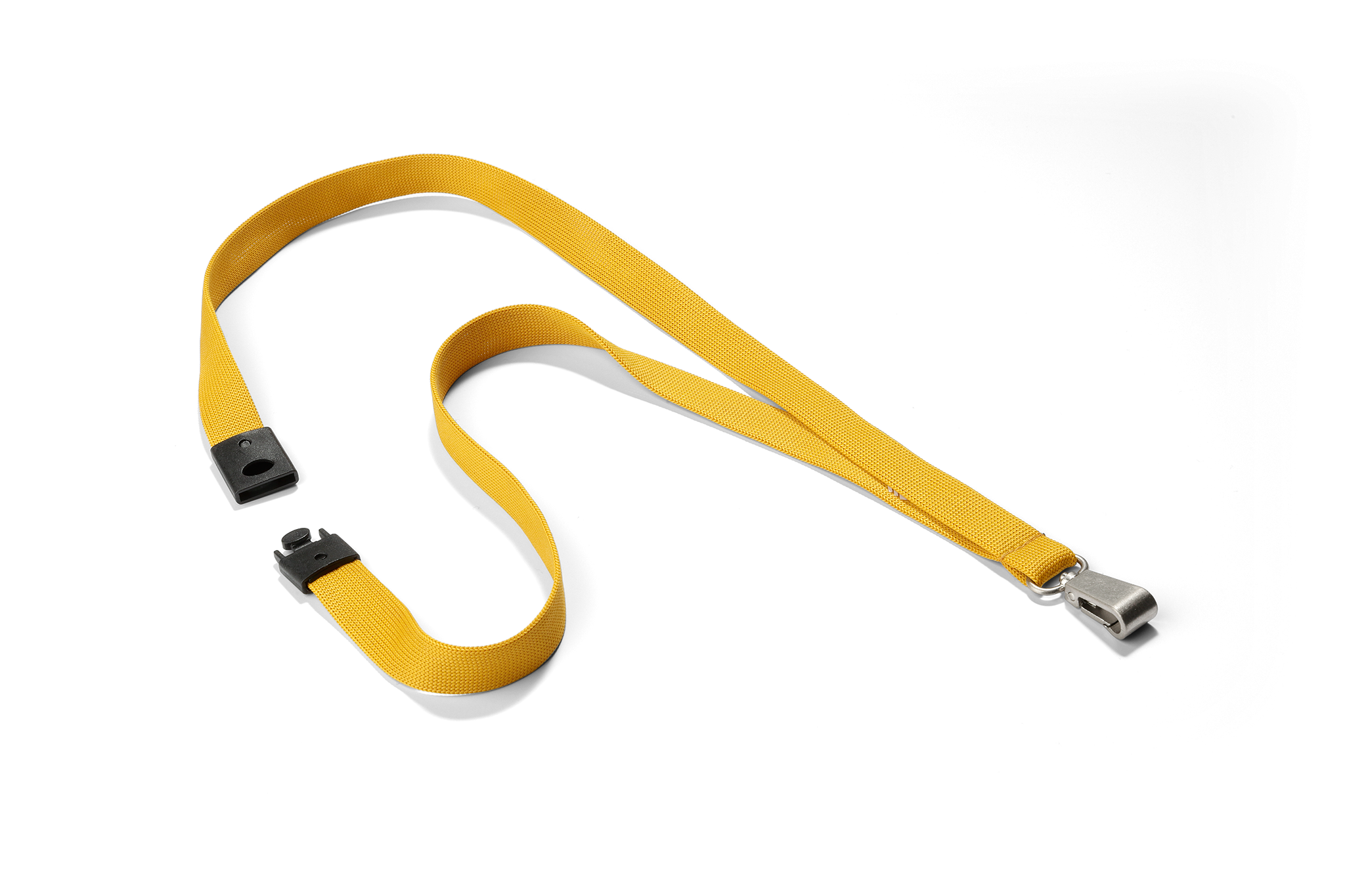 Premium halssnor af silkeagtig stof og sikkerhedsmekanisme der åbner, hvis halssnoren bliver fanget. Den 12 mm brede karabinhage af metal passer til alle kortholdere og kongresmærker med udstansede brede huller. Designet af karabinhagen sikrer at kortholderen hænger i den rigtige position og kan læses. Længde 44 cm, bredde 1,5 cm.