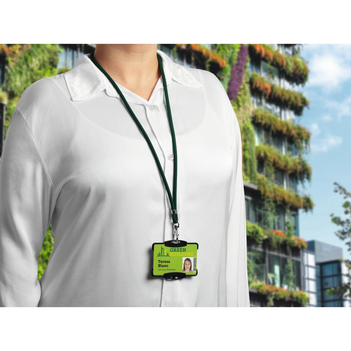 Rundvævet halssnor af genanvendt PET med sikkerhedslås, der åbner, hvis man hænger fast i noget – en kombination af miljøfokus, funktionalitet og design. Roterbar karabinhage af metal. Halssnoren bruges sammen med kortholdere til adgangskort, navneskilte med hul eller nøgler. Halssnoren består af 80% genanvendt materiale og er 100% genanvendeligt. Længde: 46 cm