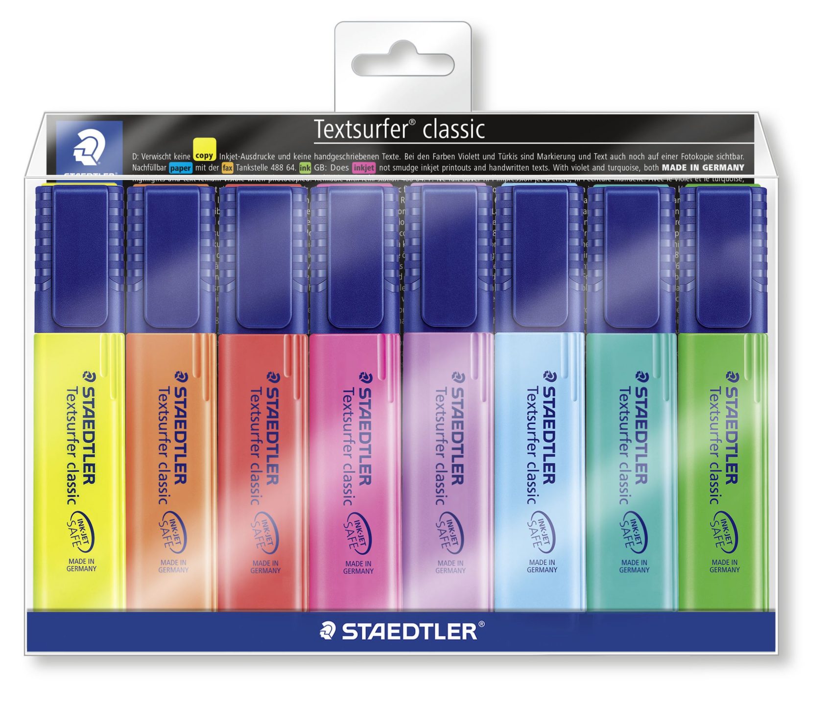 Pakke med 8 stk. Staedtler Textsurfer overstregningstusser i assorterede farver. Textsurfer tusser har blæk, der tørrer hurtigt og ikke tværer teksten ud. Den firkantede spids giver en streg på 1-5 mm, alt efter hvordan du vender den.