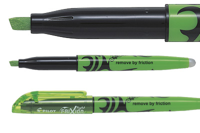 Pilot Frixion er en overstregningstusch med en særlig blæk, der bliver usynlig, når den bliver varm. Blækket kan “viskes ud” ved at gnubbe enden af overstregningstuschen mod papiret, på samme måde som man bruger et viskelæder. Bemærk at blækket også kan blive usynligt, hvis det bliver varmt på andre måder. Spidsen er firkantet, så du selv kan styre stregbredden.