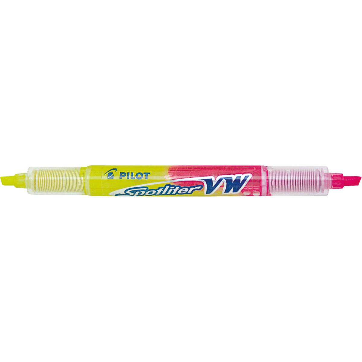 Overstregningspen med 2 farver. Spotliter VW er en overstregningspen med 70% gul blæk og 30% pink blæk i samme pen. Det flydende blæk giver en jævn overstregning med intens neon-farve uanset skrivehastighed. Overstregningspennen skriver til sidste dråbe, og kan ligge uden hætte i flere dage uden at tørre ud. Den stive og meget holdbare spids har en diameter på 3,6 mm og en stregbredde 3,3 mm. Overstregningspennen er en del af Pilots Begreen serie og den er fremstillet af 78,8 % genanvendt plastik.