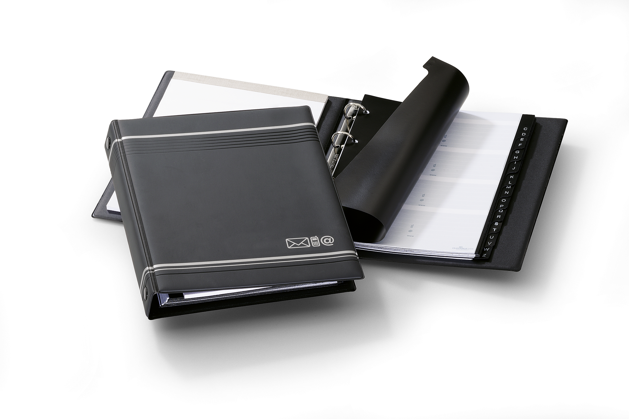 Adressemappe A5 med ringmekanisme. Leveres med 25 papindsatse med plads til 200 adresse poster og notesblok (50 ark) i forsiden. Kan udvides med 10 papindsatse med plads til 80 adresse (varenr.2456). 12 delt register A-Z. Mål: HxB 230x175mm.
