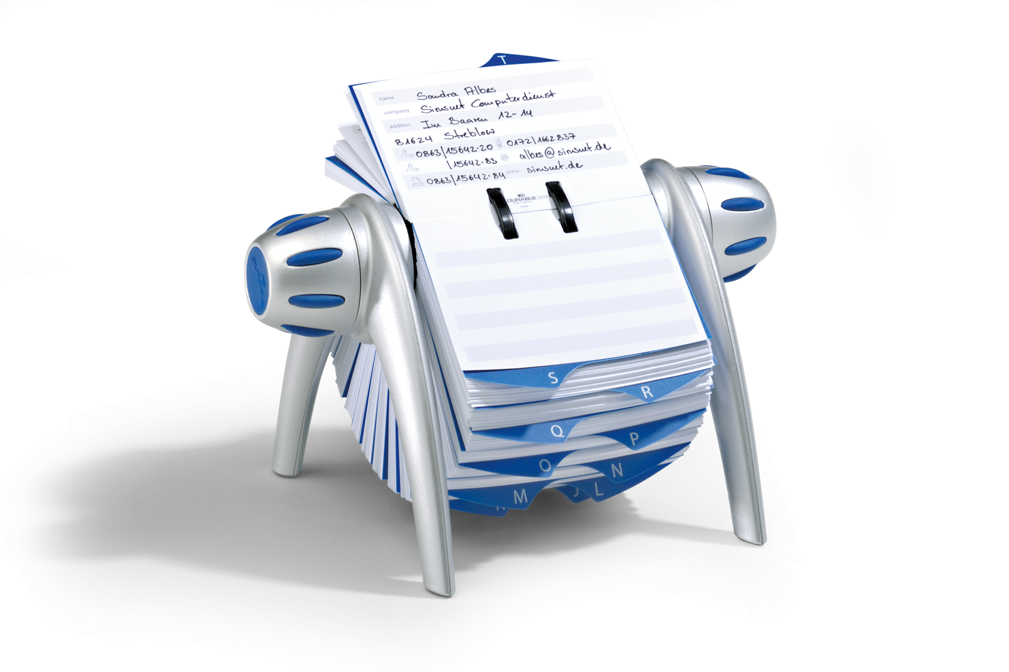 Rullekartotek til telefonnumre og adresser. Med blød rotation og låsefunktion. Leveres komplet med 500 dobbeltsidet kartotekskort (104×72 mm) og 25 delt indexfaner A-Z. Enkel fjernelse og indsættelse af kartotekskort. Mål: BxHxD 215x120x185