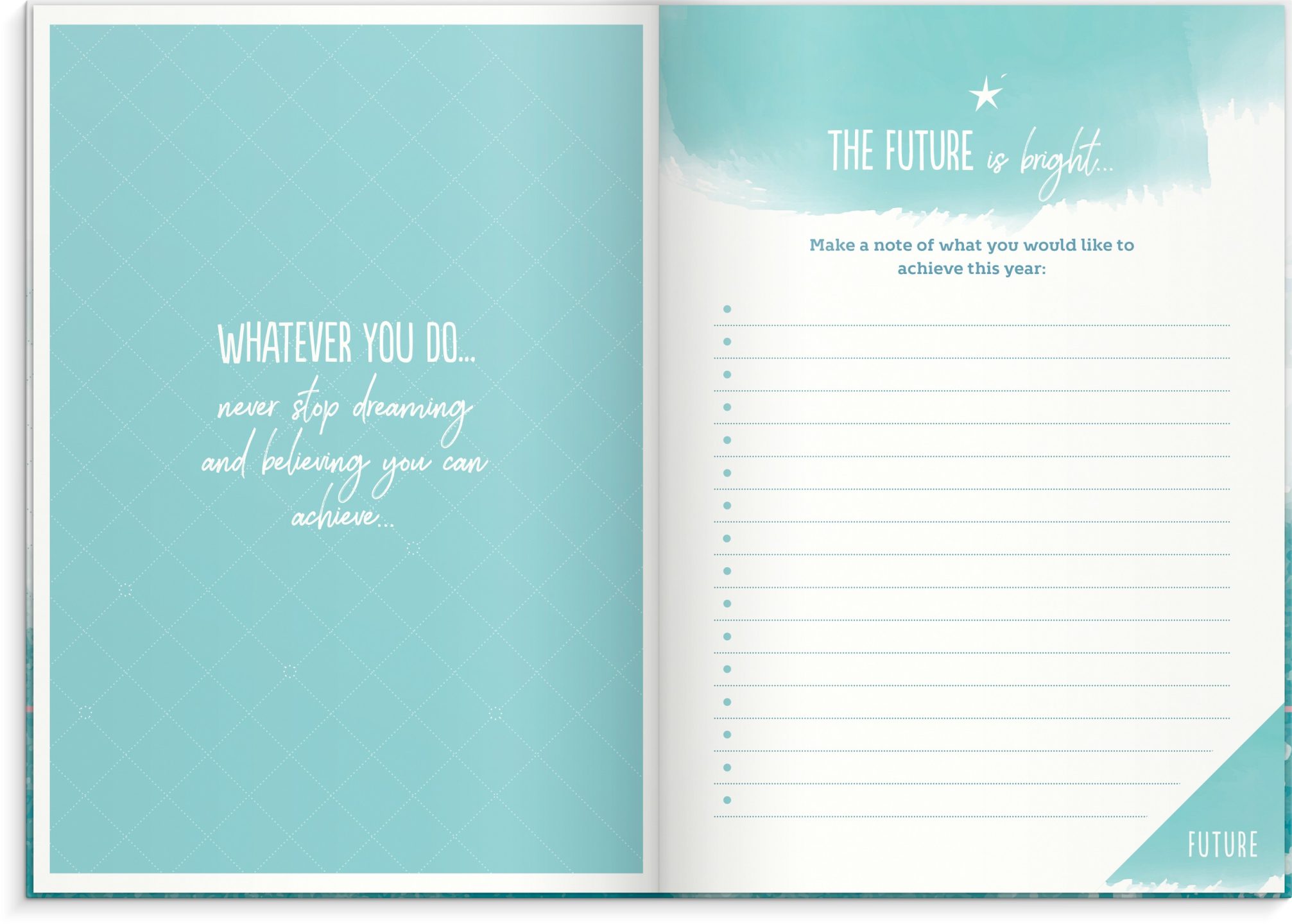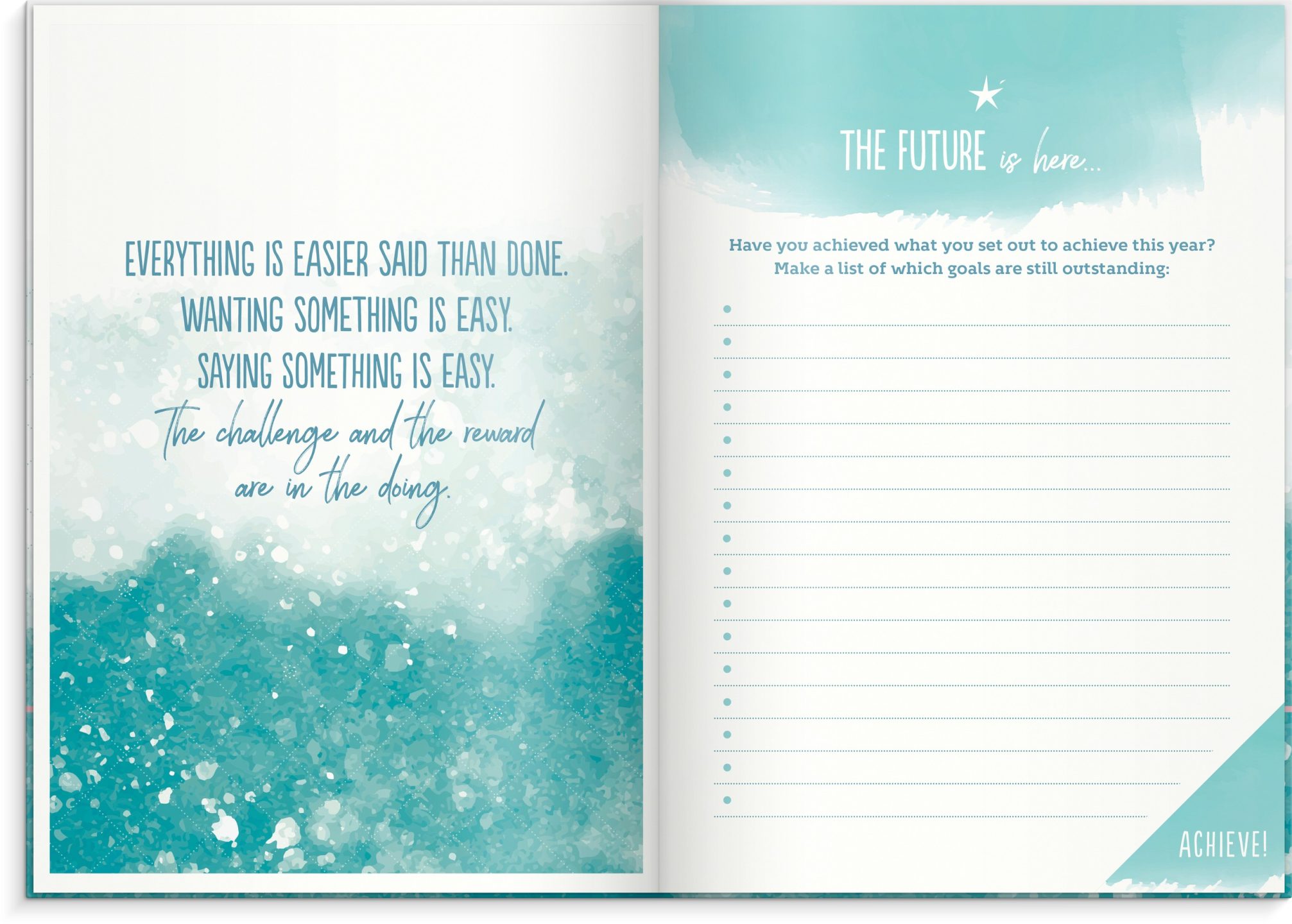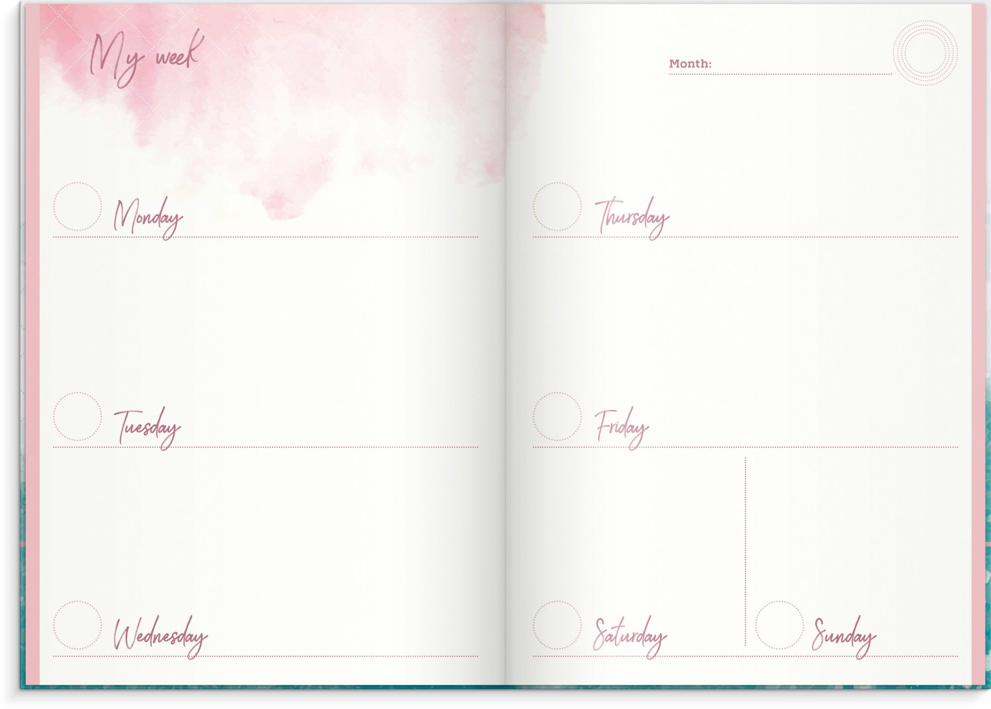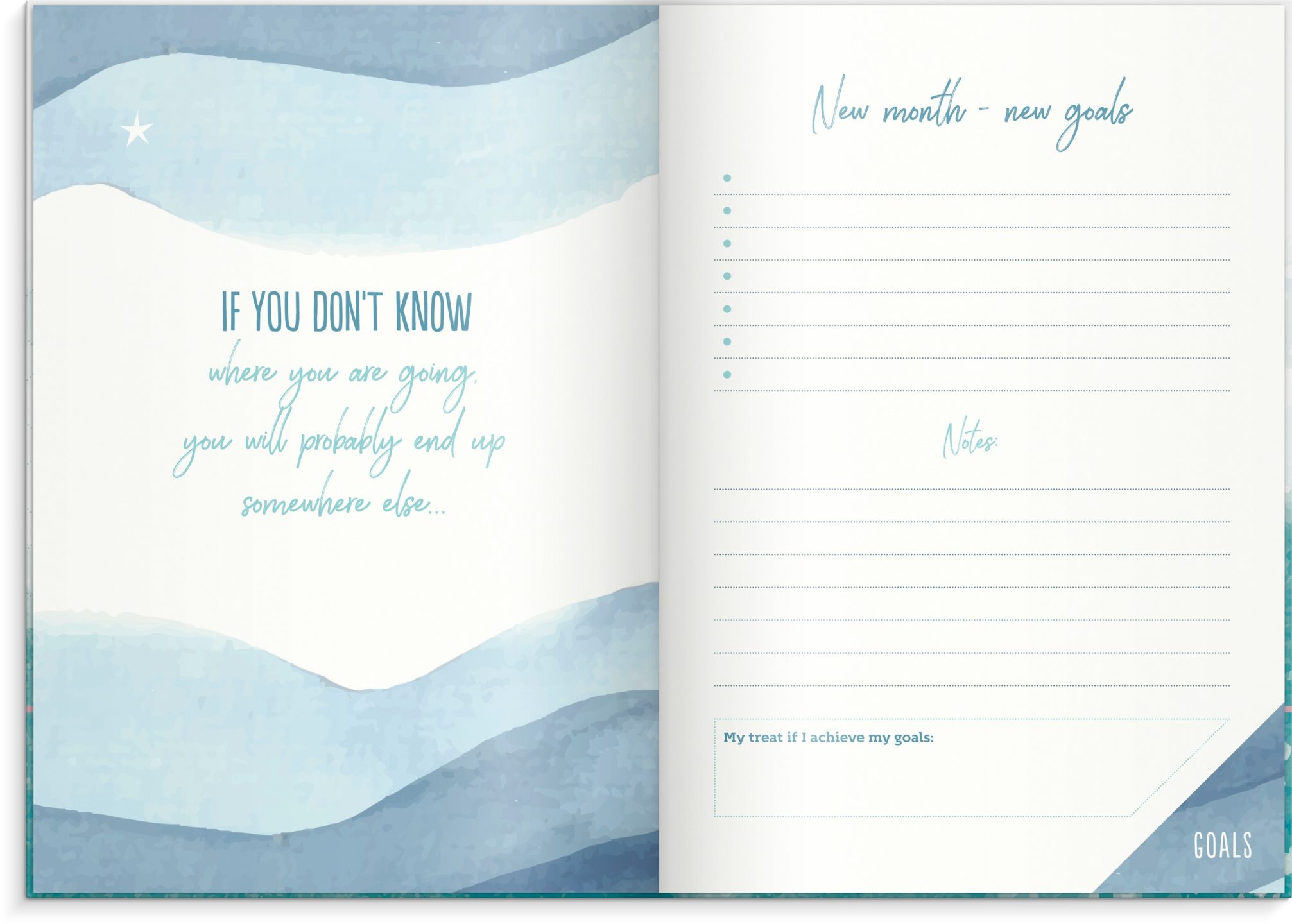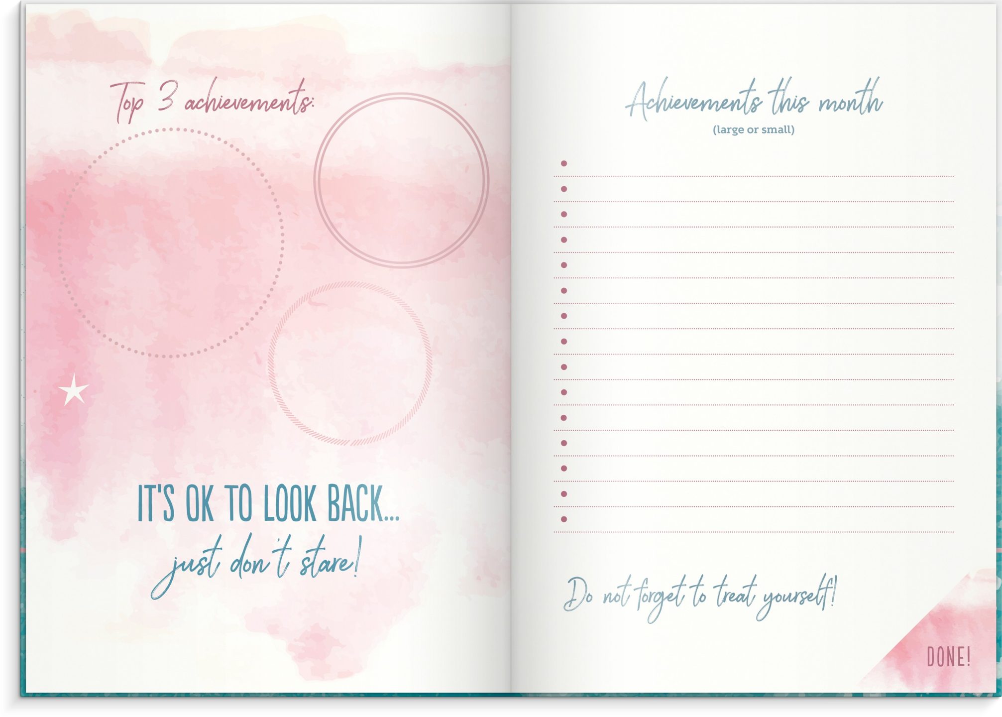 Udateret indbundet kalender med rosa mærkebånd og hårdt omslag i karton, mærkebånd og elastik. Et planlægningsværktøj til at opnå sine drømme og mål. Kalenderen indeholder sider med inspirerende citater, plads til mål, reflektioner og noteringer. Noter års-, og månedsmål. Efter hver måned findes en side til evaluering af den forgangne måned 100 g cremefarvet papir, 128 blade (256 sider). FSC®. Format: 165×233 mm.
