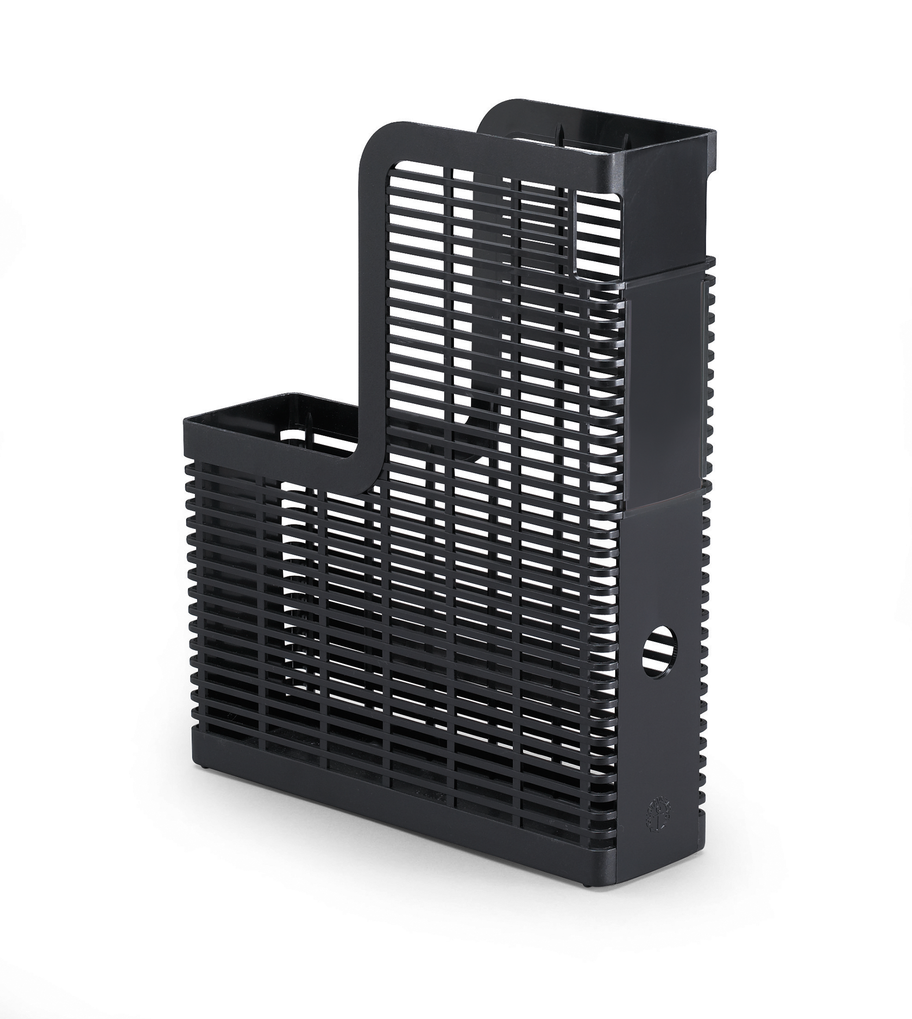 Tidsskriftholder med fingerhul som gør det nemt at trække den ud af hylden. Af polystyren plast (min. 80% genbrugsmateriale). Produktet er miljøcertificeret af miljømærket Blue Angel. Mål 71x315x246mm (BxHxD)