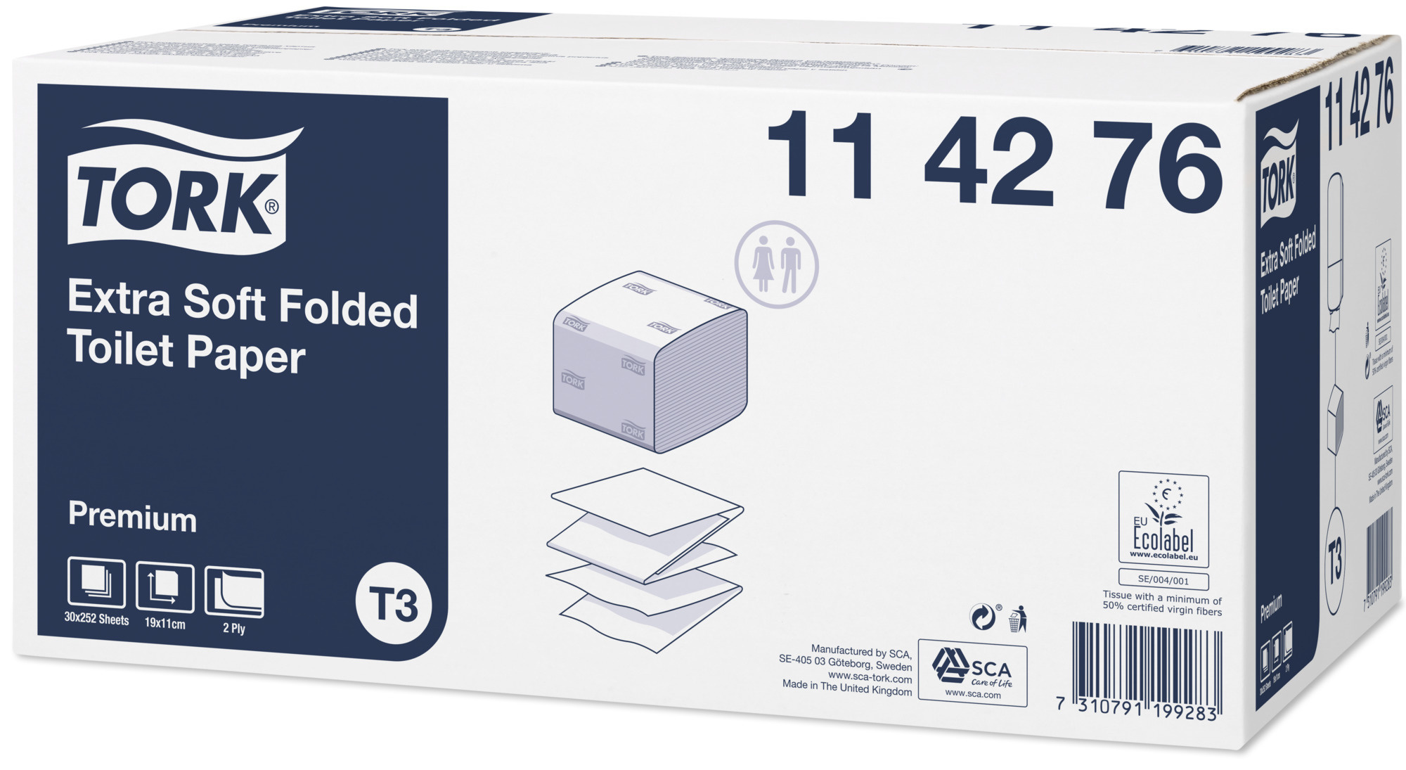 Tork-systemet til foldet toiletpapir tilbyder hygiejnisk én-ad-gangen dispensering for mindre spild og vedligeholdelsesudgifter. Tork Extra Soft Foldet Toiletpapir Premium er en perfekt blanding af kvalitet og funktion. Systemet er til toiletter med lav/middel brugerfrekvens, især i sundhedssektoren og HoReCa.