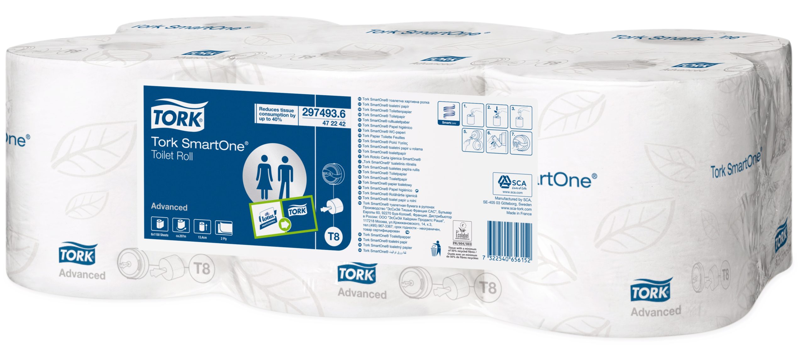 Tork SmartOne Toiletpapir har hygiejnisk ét-ark-ad-gangen funktion og er med til at reducere forbruget med op til 40% sammenlignet med traditionelle jumborulledispensere, hvilket betyder flere besøg pr. rulle. Tork SmartOne Mini ruller med høj kapacitet er velegnede til toiletter i krævende omgivelser med lav, middel eller høj brugerfrekvens, afhængigt af den valgte Tork SmartOne Mini dispenser.
