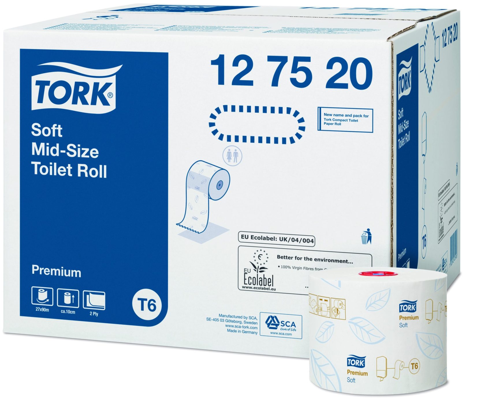 Dette toiletpapir passer til Tork Dispenser T6, som er et moderne og effektivt system, der er velegnet til toiletter med lav til middel brugerfrekvens. Tork Soft Mid-size Premium toiletpapir er kompakte, mellemstore ruller: En rulle svarer til 4-5 standardruller.