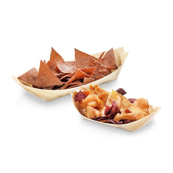 Det lille fad er lavet af tyndt fyrretræsspån. Det er velegnet til portionsanretninger. Kan bruges til både kolde og varme anretninger. Fadet er biologisk nedbrydeligt og kan komposteres. Til engangsbrug.
