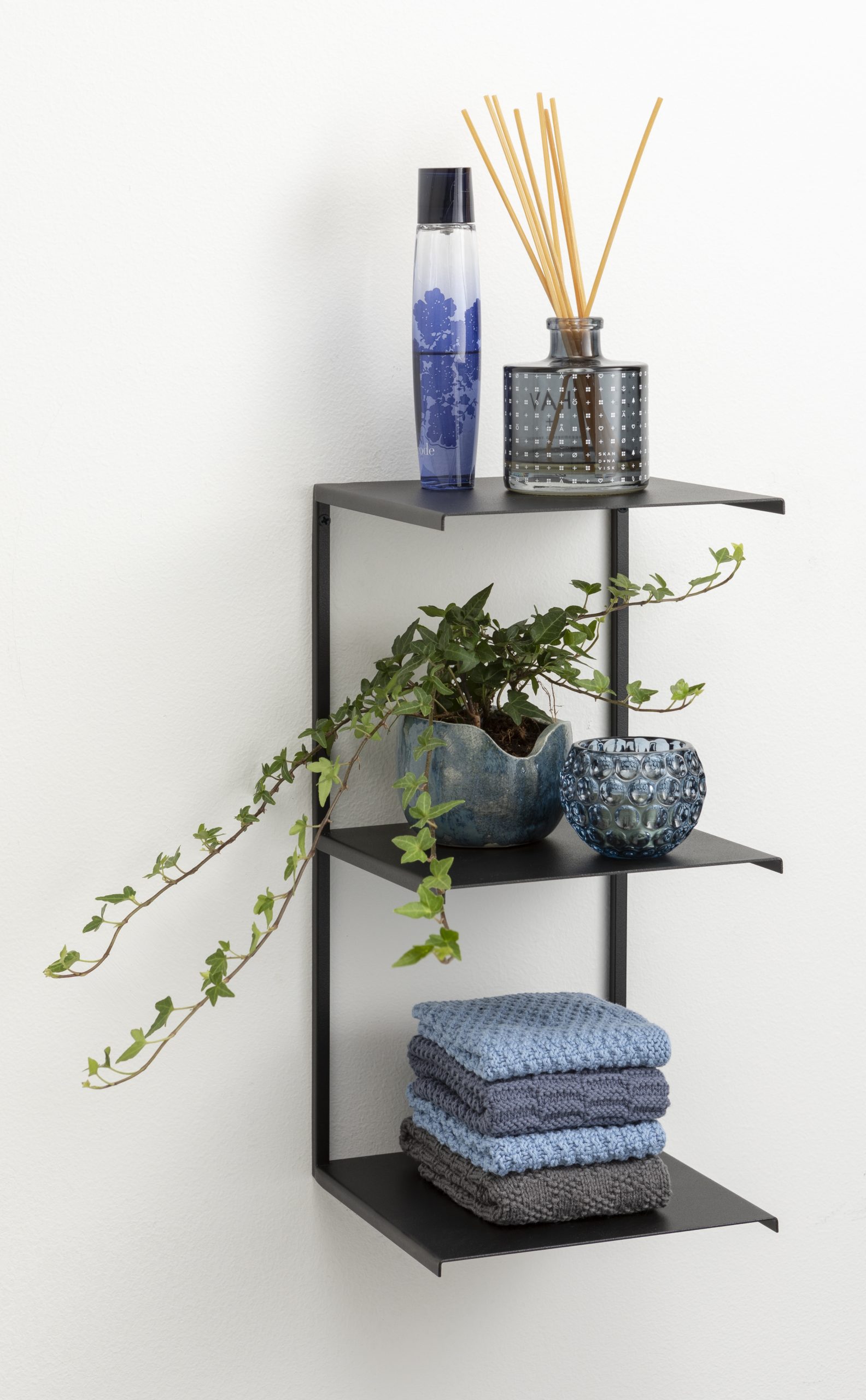 Tredobbelt hylde, sort metal. 20 x 20 x 40 cm.Sort metal hylde som er velegnet til at hænge på væggen flere steder i hjemmet. Brug den f.eks. på badeværelset til opbevaring af dine hudplejeprodukter eller parfumer, som du gerne vil have nem og hurtig adgang til. Med tre hylder er der rig plads til opbevaring af småting eller pynteting.