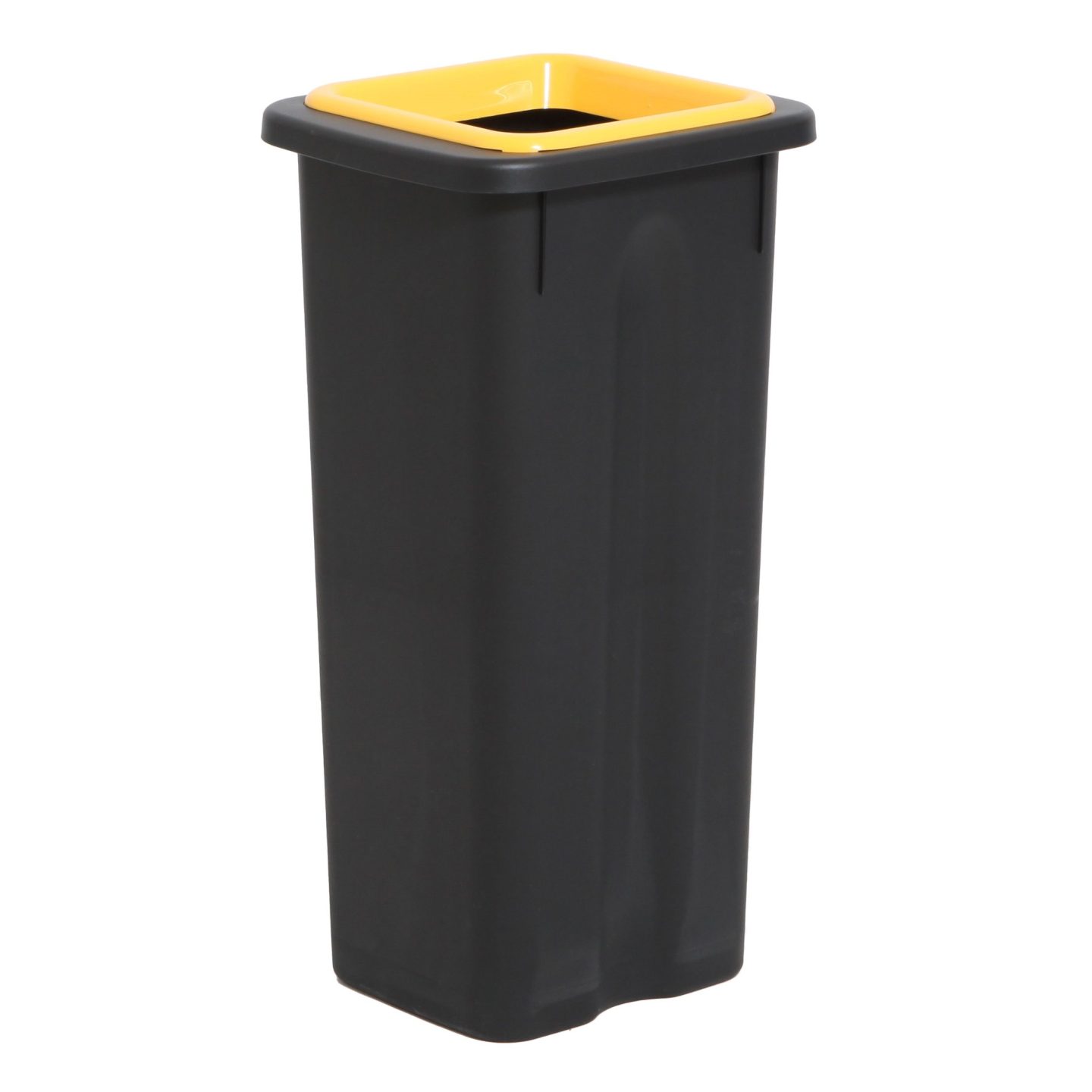 Denne lille TWIN affaldsspand til affaldssortering er udført i sort, kraftig, 100% genanvendt plastik med en kapacitet på 20l og gult låg. TWIN affaldsspande er et billigt, økonomisk og miljøvenligt alternativ til dyre sorteringssystemer, der er tilgængelige på markedet. Disse små TWIN affaldsspande passer perfekt til sortering i f.eks. hjemmet eller på kontoret. Kapacitet på 20l. Sort skraldespand med gult låg. 100% genanvendt plastik. Kan sættes i en Style base / fod sammen med ekstra spande i f.eks. andre farver for at skabe et sorteringssystem. Base og ekstra spande købes separat.