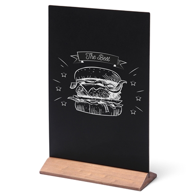 Menukortholder med fleksibel, skrivbar, dobbeltsidet kridttavle overflade på solid, lysebrun træfod til bord. En stilet og prisoverkommelig skrivetavle til at designe og præsentere dine menukort, annoncer, prislister, tilbud og budskaber på.Kridttavlen sidder godt fast i træfoden, men kan alligevel nemt afmonteres når den skal rengøres eller skiftes ud. En perfekt menuholder til restauranter, caféer, kantiner, madboder, foodtrucks og fastfood kæder