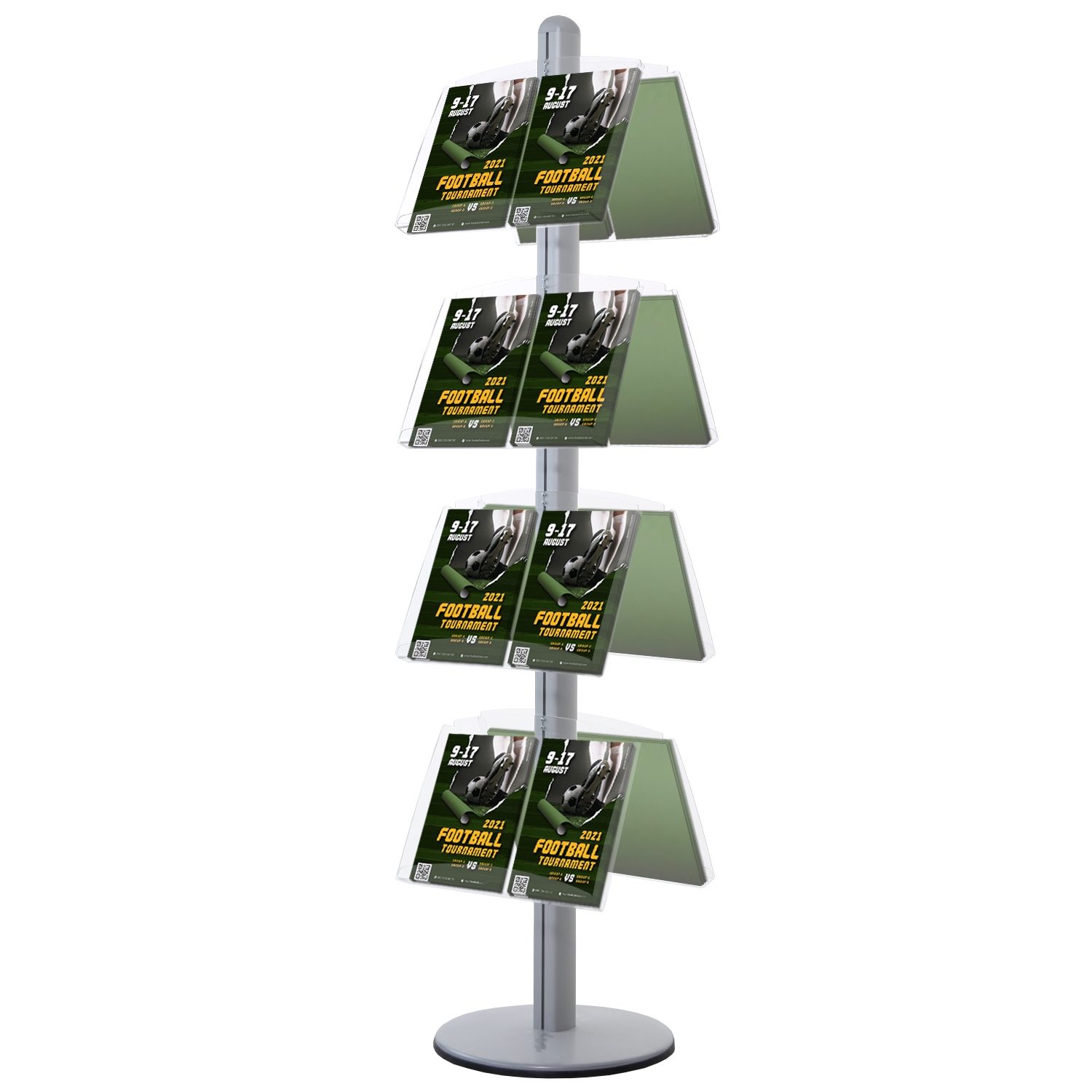 TWIN ProStand Dobbeltsidet brochurestativ med akrylhylder – 16 xA4 er et kraftigt og alsidigt aluminium brochurestativ med 16 stk A4 akryl brochure hylder på begge sider. Vores Prostand har en tung fod, som gør at standeren er meget stabil så den ikke kan vælte. TWIN ProStand Dobbeltsidet brochurestativ med akrylhylder – 16 xA4 er dobbeltsidet og har fire hylder på hver side af standen. Dette giver muligheden for at vise brochurer og magasiner i forskellige sider. Kraftigt og alsidigt dobbeltsidet brochurestativ. Nem montage og har mange indstillingsmuligheder. 8 Akryl display hylder til enten 16 x A4 eller 8 x A3 brochurer.