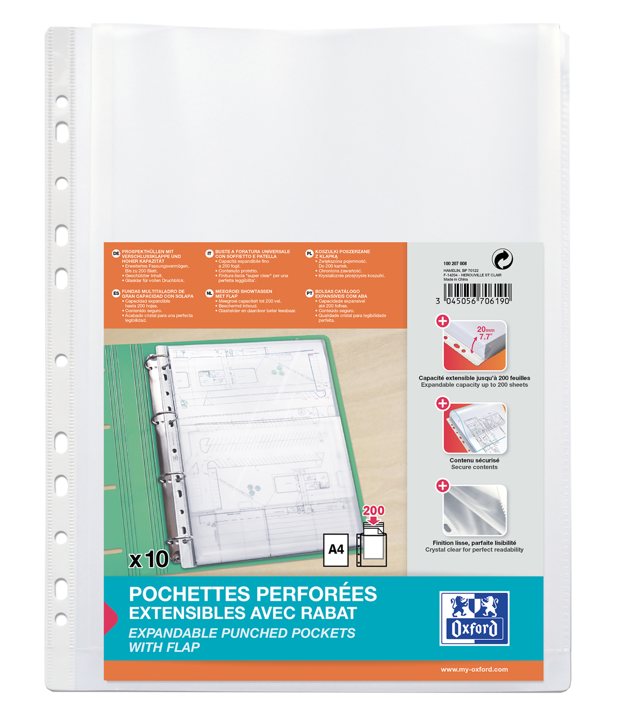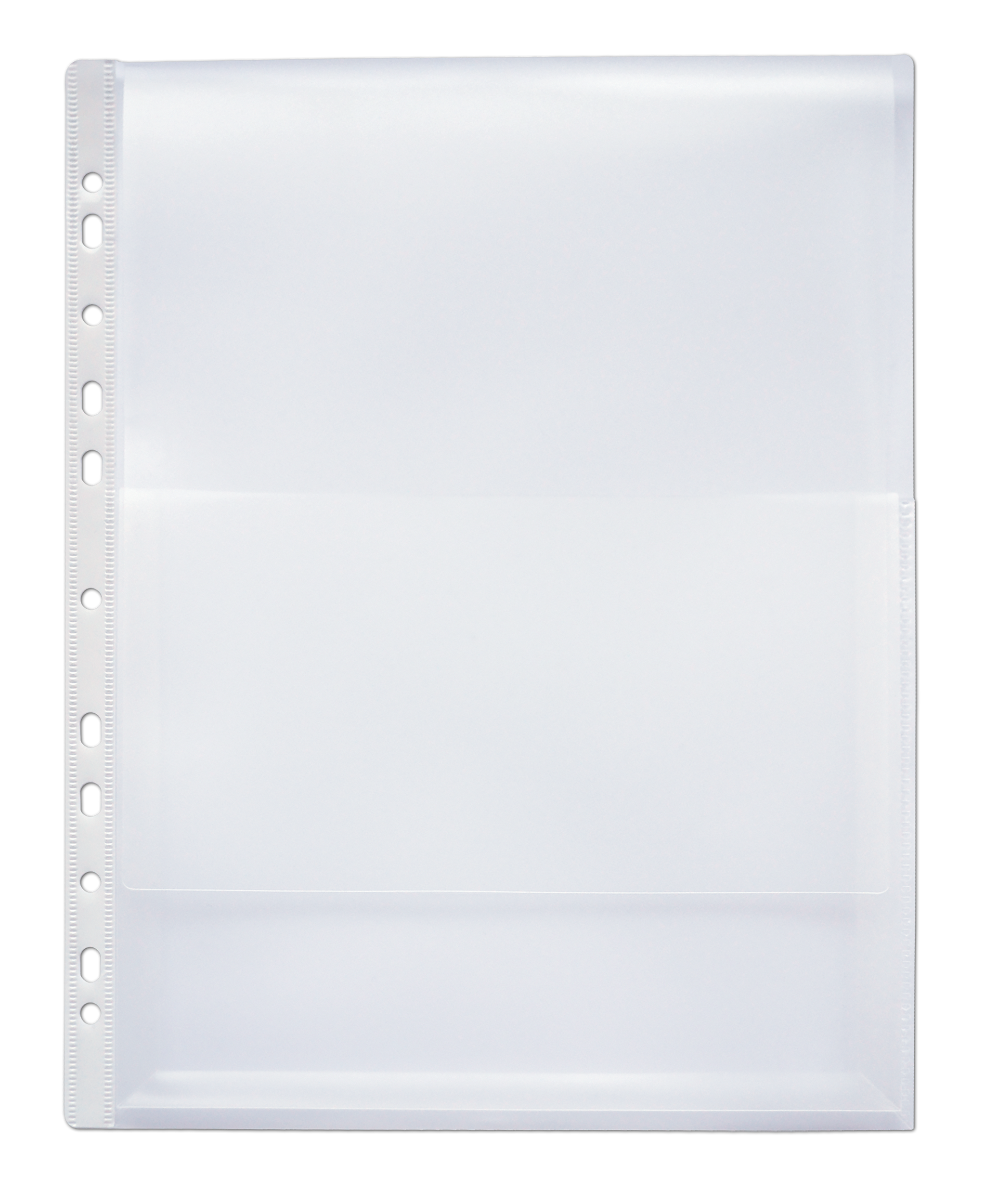 Format: A4. Kan indeholde 200 ark. 200? glat polypropylen. Åbning: øverst. Stansning: 11 huller. Forstærkningsstrimmel: hvid. Klar. Pose med 10.